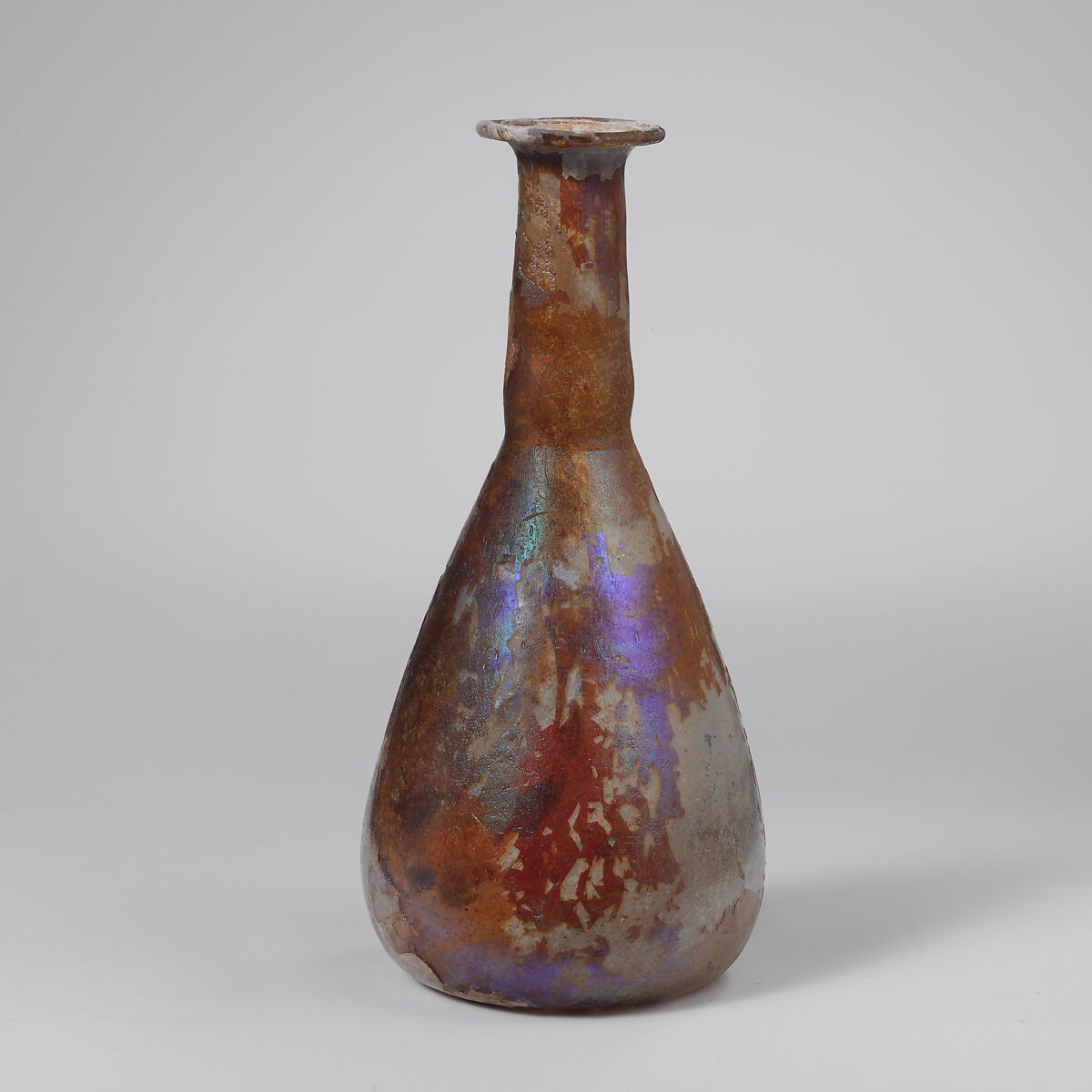 Rim folded out, over, and in; cylindrical neck, expanding downward, with tooling around base; elongated piriform body with convex sides; concave bottom.