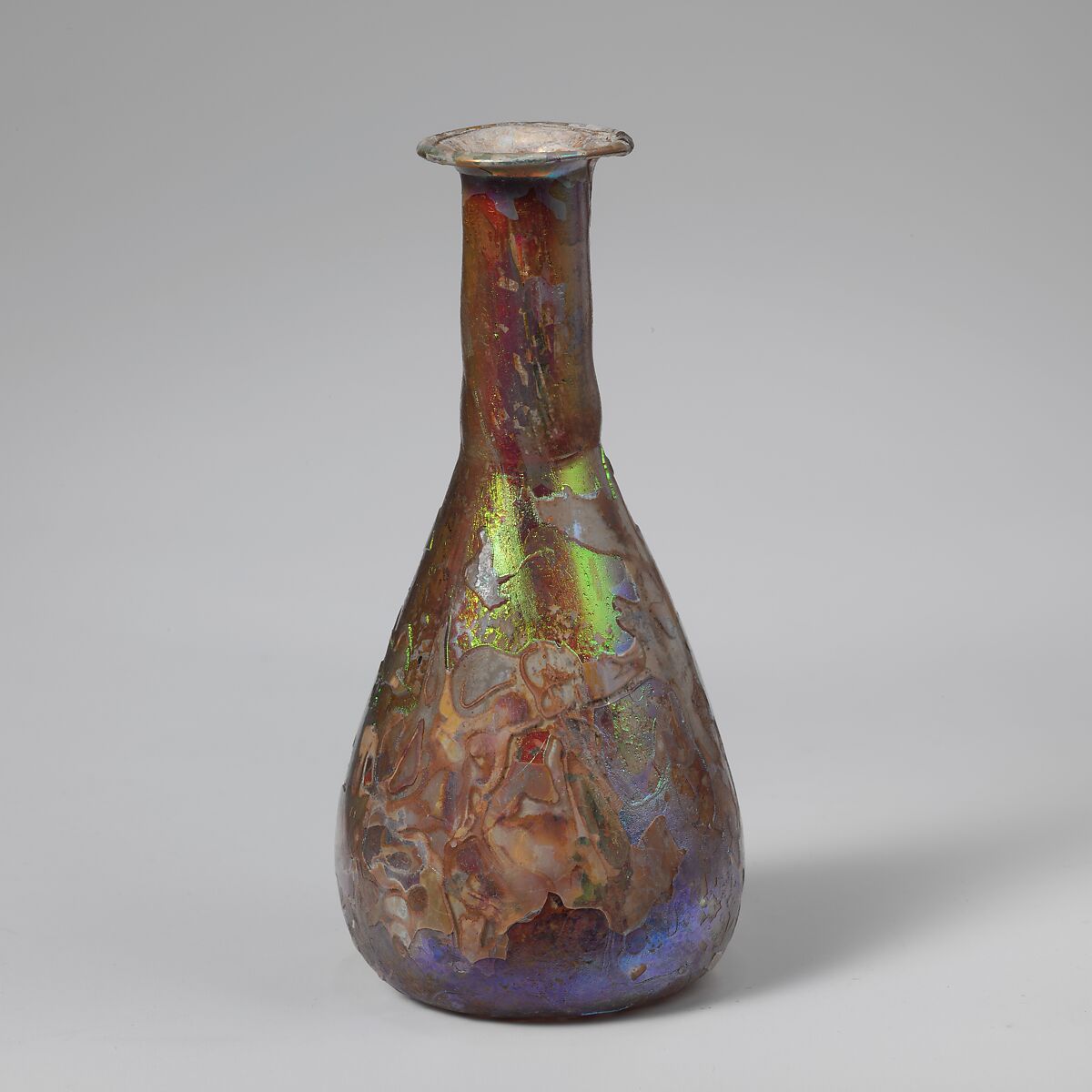 Rim folded out, over, and in; broad mouth; cylindrical neck with slight bulge towards bottom and tooling around base; elongated piriform body with almost straight sides; concave bottom.