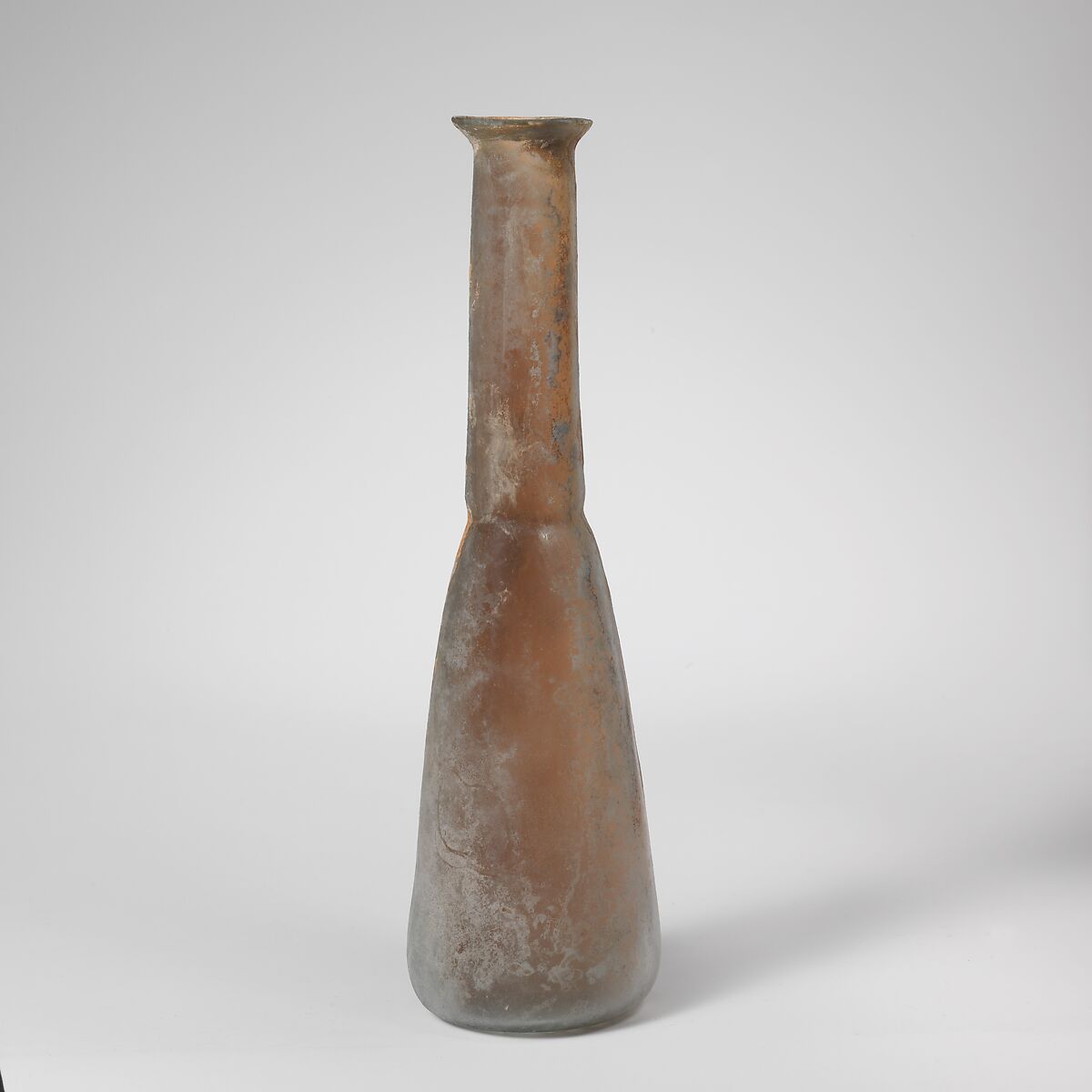 Plain, rounded rim; flaring mouth; cylindrical neck, expanding downward and tooled in around base; elongated conical body with convex sides; flat bottom.