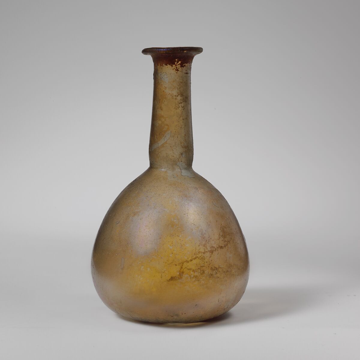 Rim folded out, over, and in onto outer edge of mouth; cylindrical neck, expanding downward and tooled in around base; tall bulbous body; flat bottom.