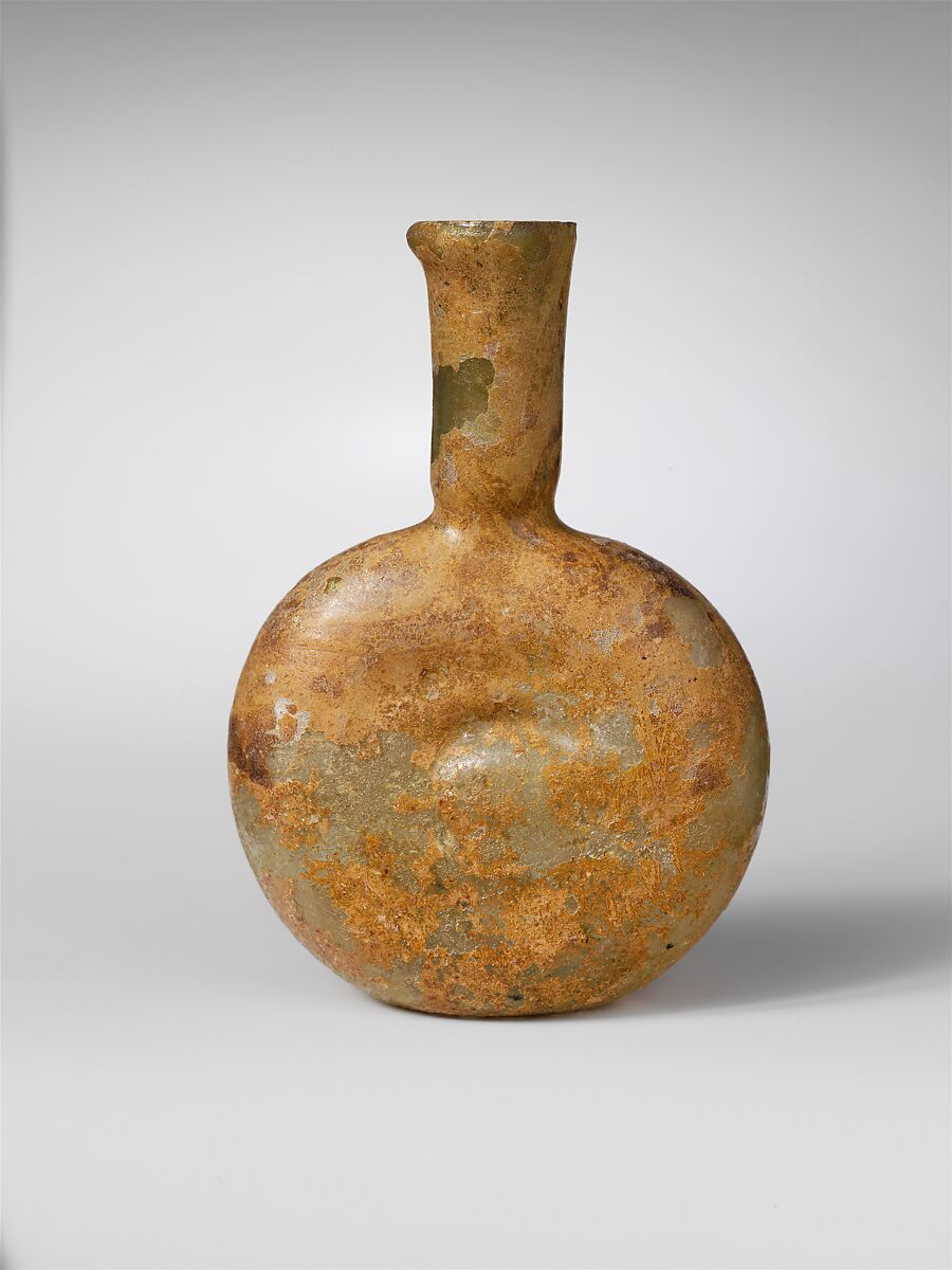 Knocked-off rim, slightly folded out, over, and in on one side; funnel-shaped neck, tooled in around base; globular, flattened body; small, flat bottom, with trace of pontil scar.