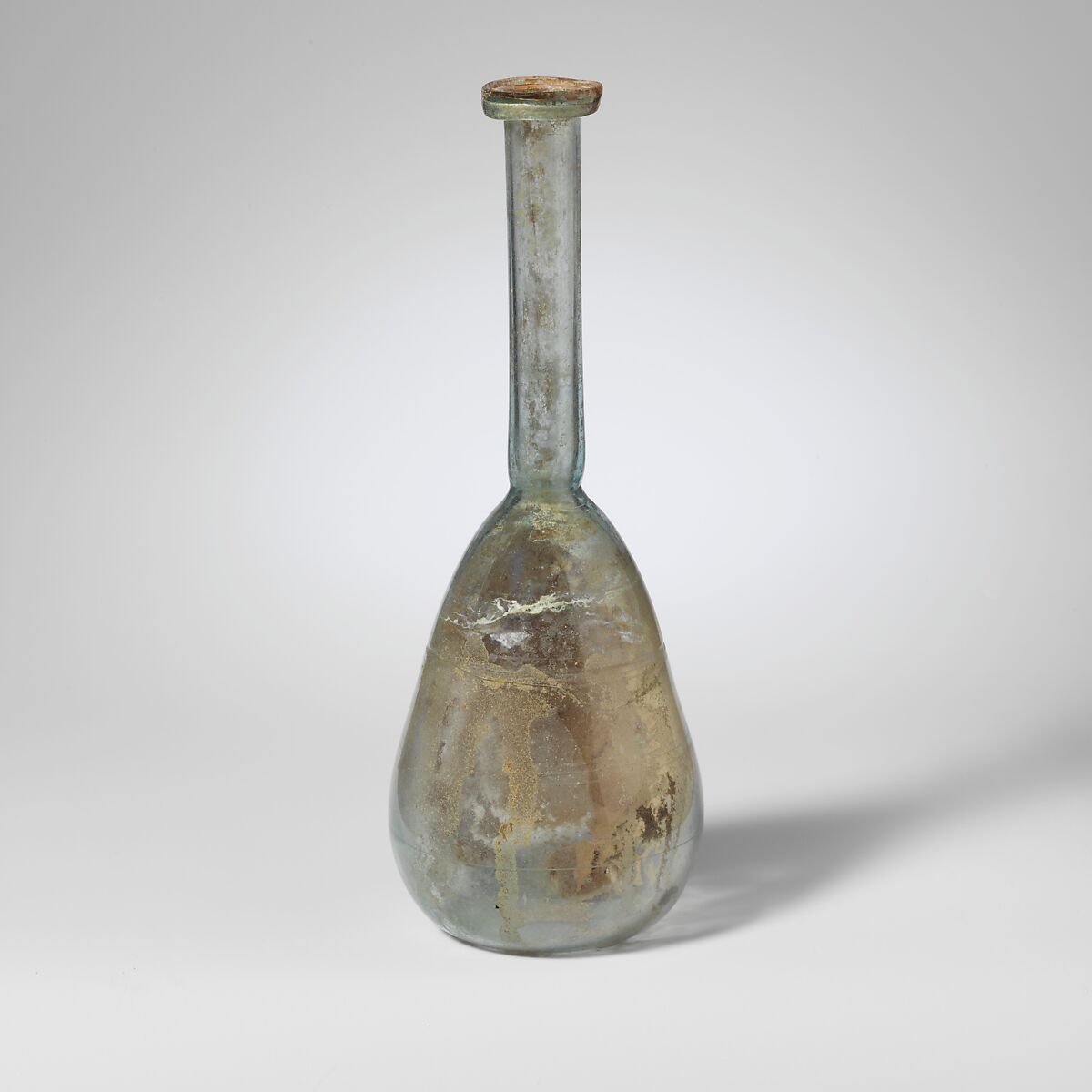 Broken and repaired around body with two small holes in side; some elongated, large, and pinprick bubbles; patches of enamel-like weathering and iridescence.