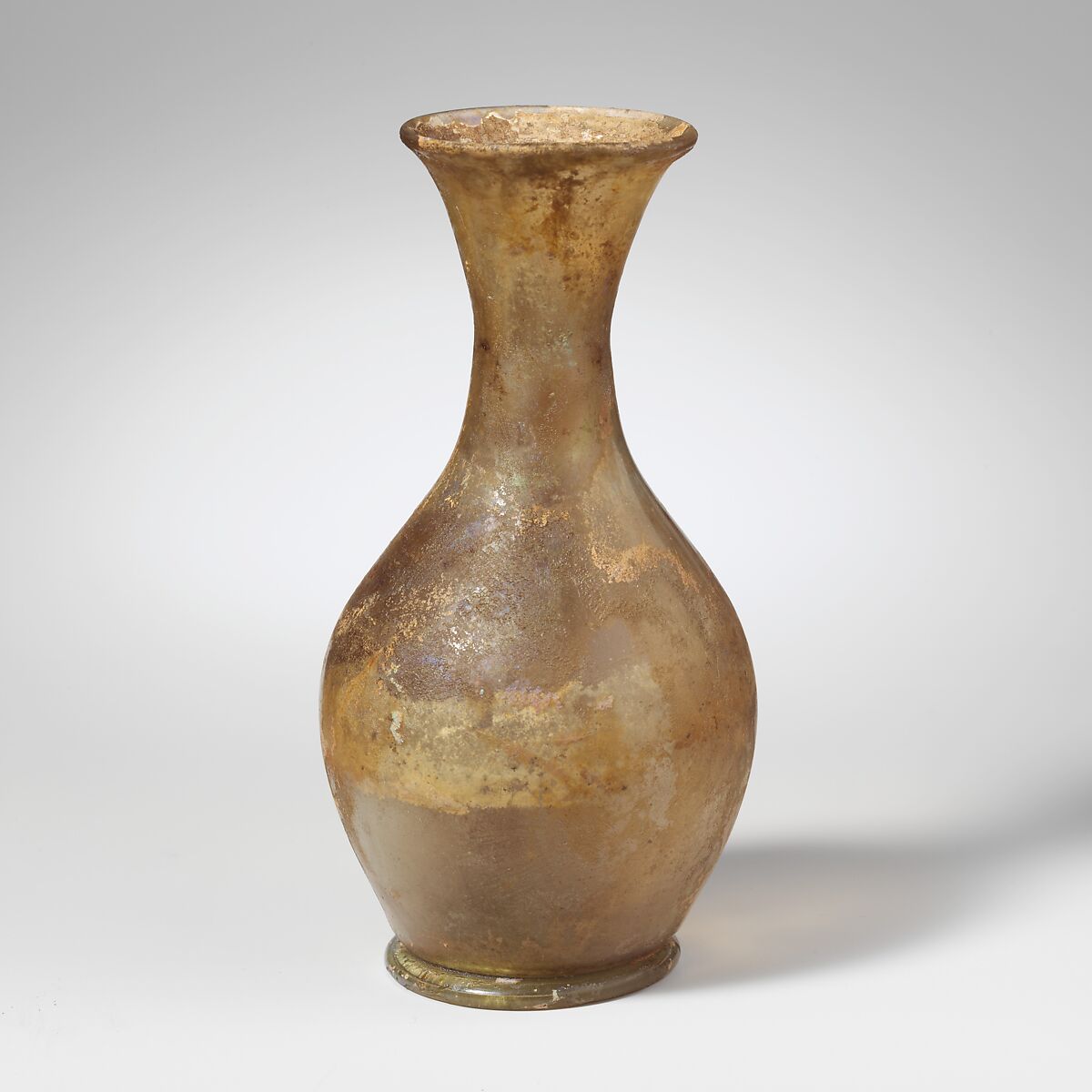 Plain, rounded rim; broad, flaring mouth; concave neck, expanding downward to join bulbous body; integral, tubular base ring; pushed-in bottom with central kick surrounded by prominent pontil scar.