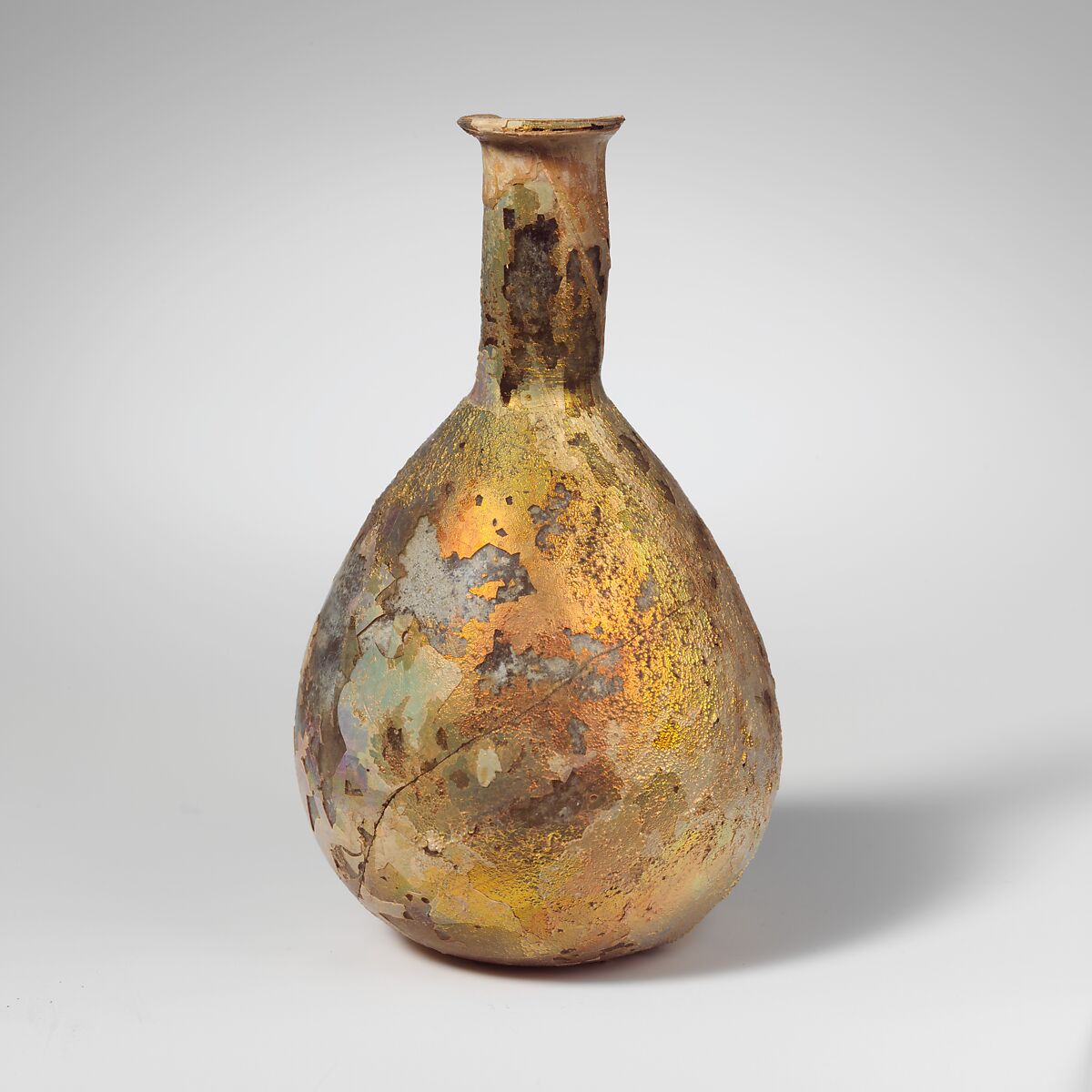 Intact, except for part of rim and large crack in body; many bubbles; deep pitting and brilliant iridescent weathering.