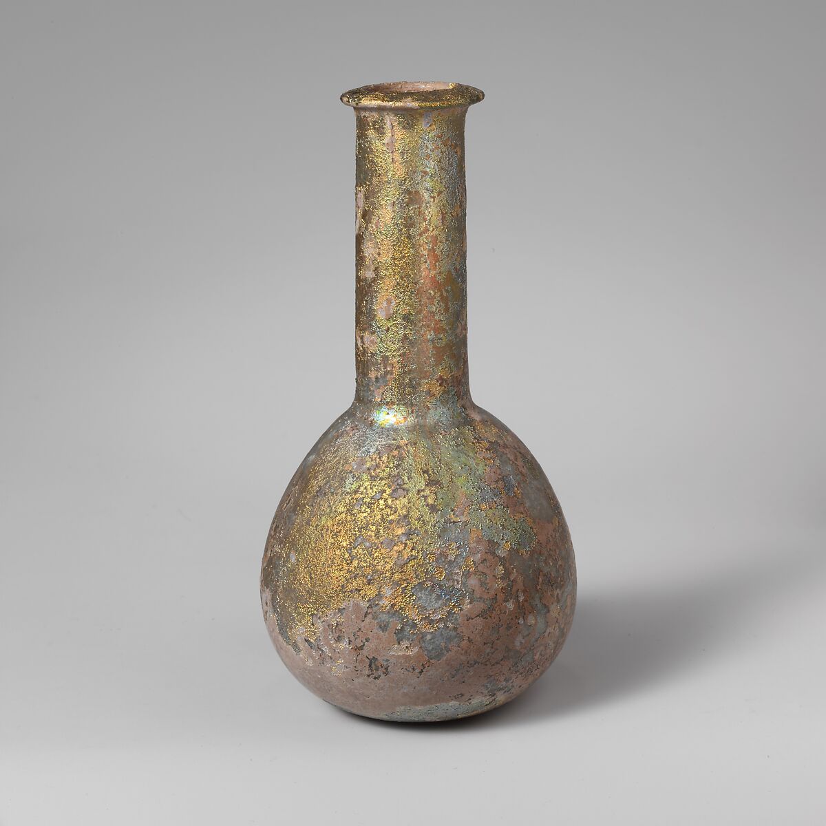 Rim folded out, over, and in, with beveled upper surface; fairly broad mouth; cylindrical neck expanding slightly downward with tooling marks around base; piriform body; rounded bottom, slightly flattened at center.