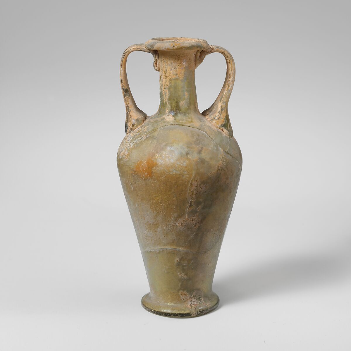 Rim folded down, round, and up, with beveled outer lip; short, flaring mouth; cylindrical neck; convex shoulder curving downward; straight, tapering sides to body, turned out to form integral base ring with slight concave bottom; two claw handles applied to shoulder, drawn up and round, then trailed onto top of neck and underside of rim.
