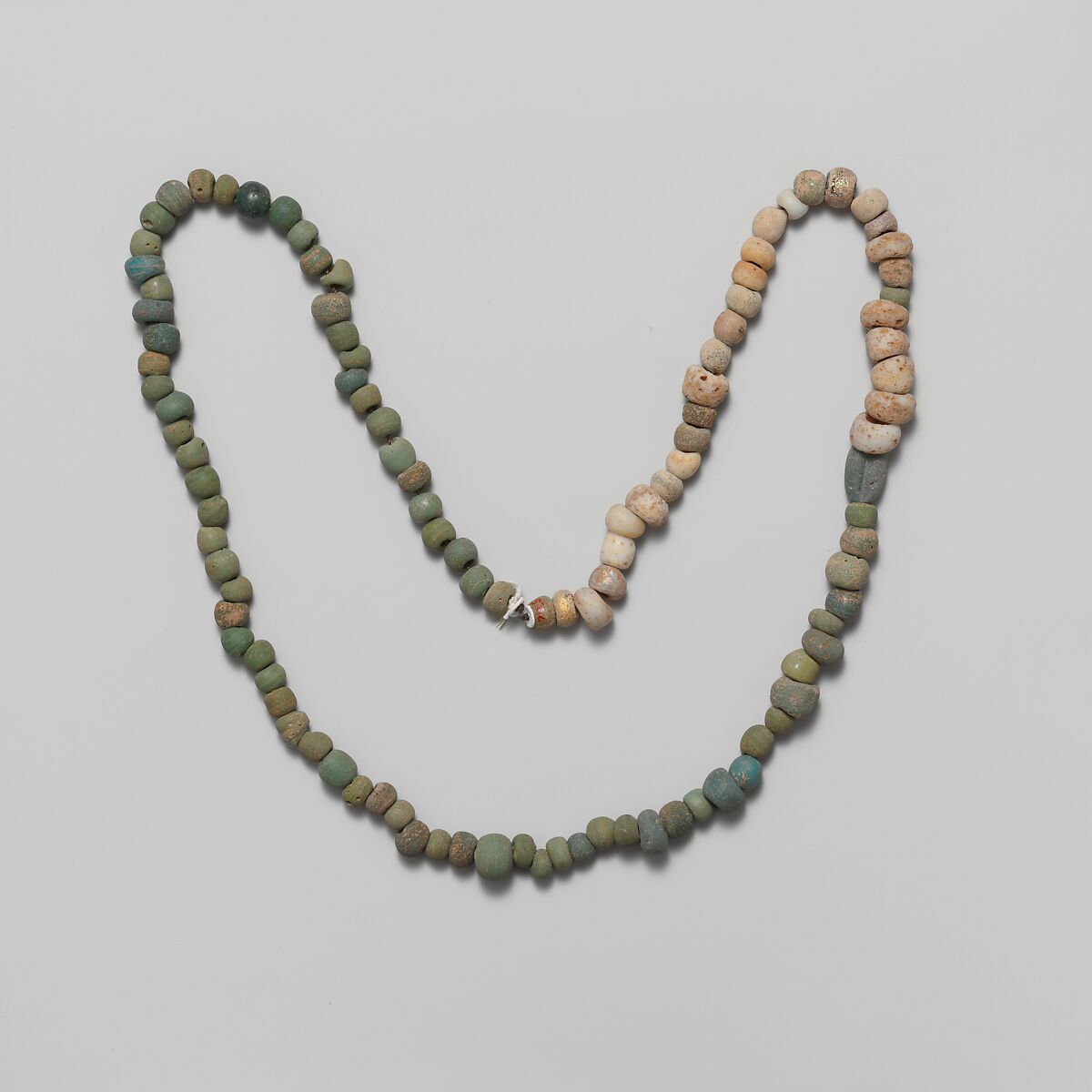 String of 88 green or blue and 17 white beads of various shapes and sizes, mainly globular or short cylindrical, but with one elongated melon bead with tooled indents along each side, and all having a large threadhole.