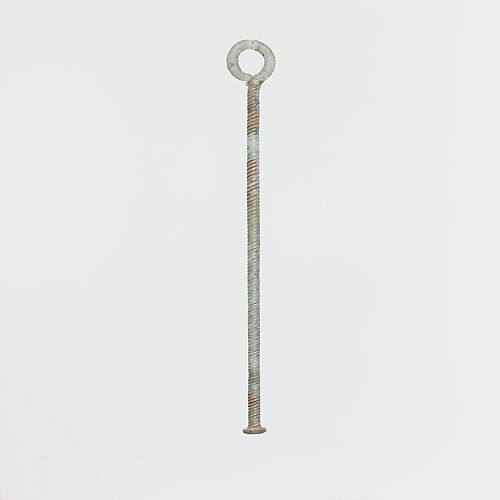 Cylindrical rod, tightly twisted to produce spiral fluting; one end tooled into a flat disk, the other is formed into a loop or ring handle by bending the rod round a full 360 degrees and attaching it to the top of the straight shaft of the rod.