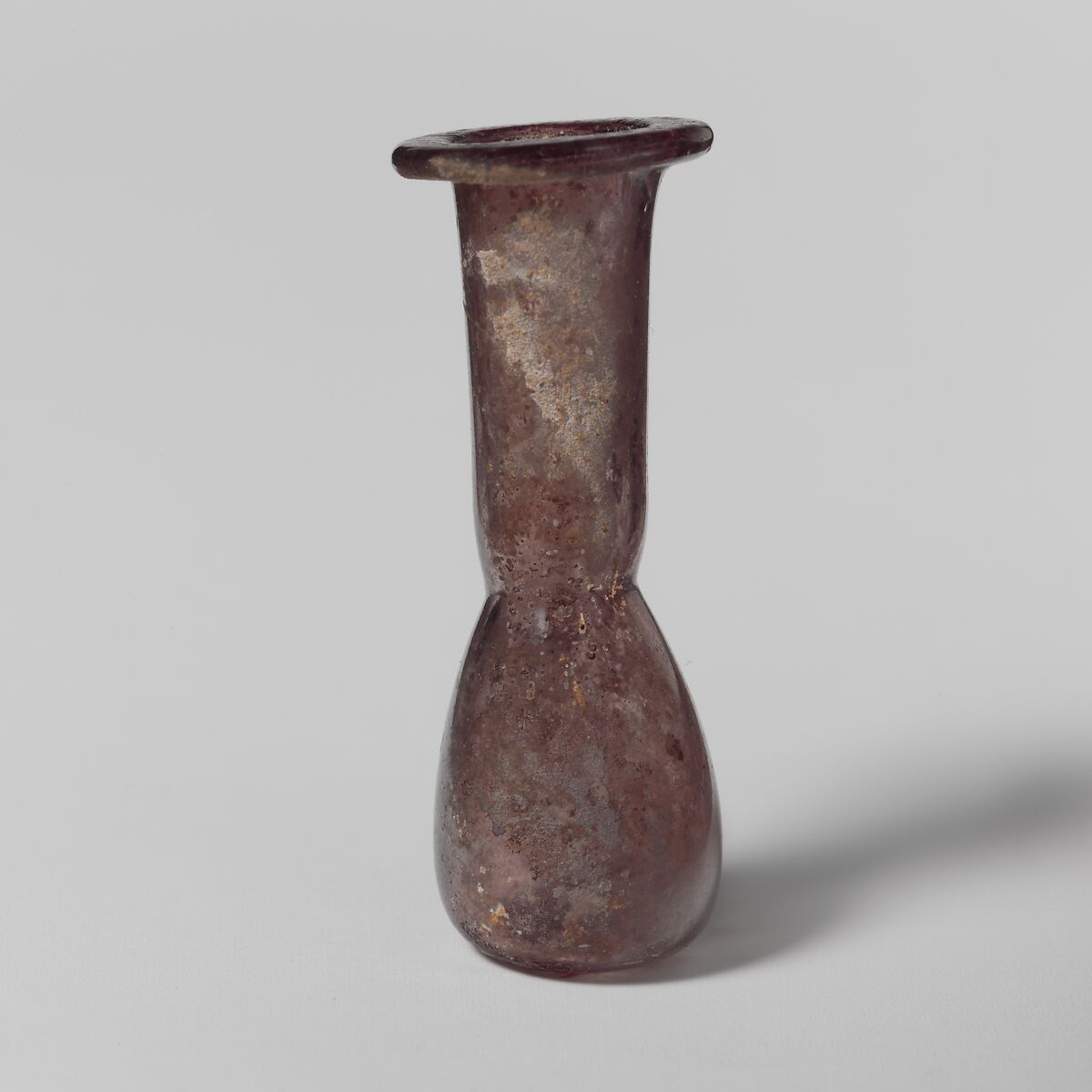 Rim folded out, over, and in, flattened on top; long, slightly funnel-shaped neck, tooled in around base; conical body with convex sides; flattened bottom, concave at center.