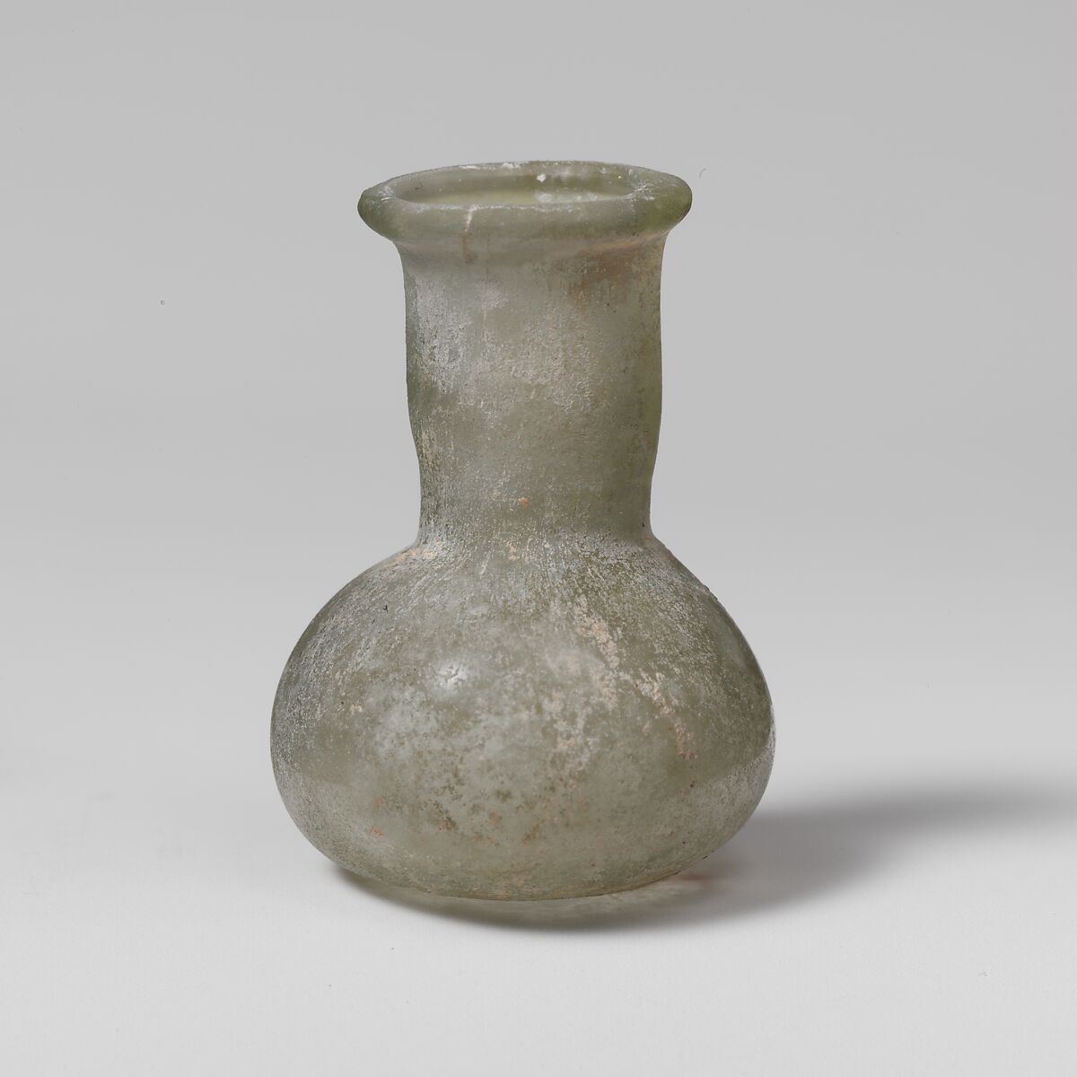 Rim folded out, over, and in; cylindrical neck, with broad, tooled-in area around base; squat bulbous body; small, slightly concave bottom.