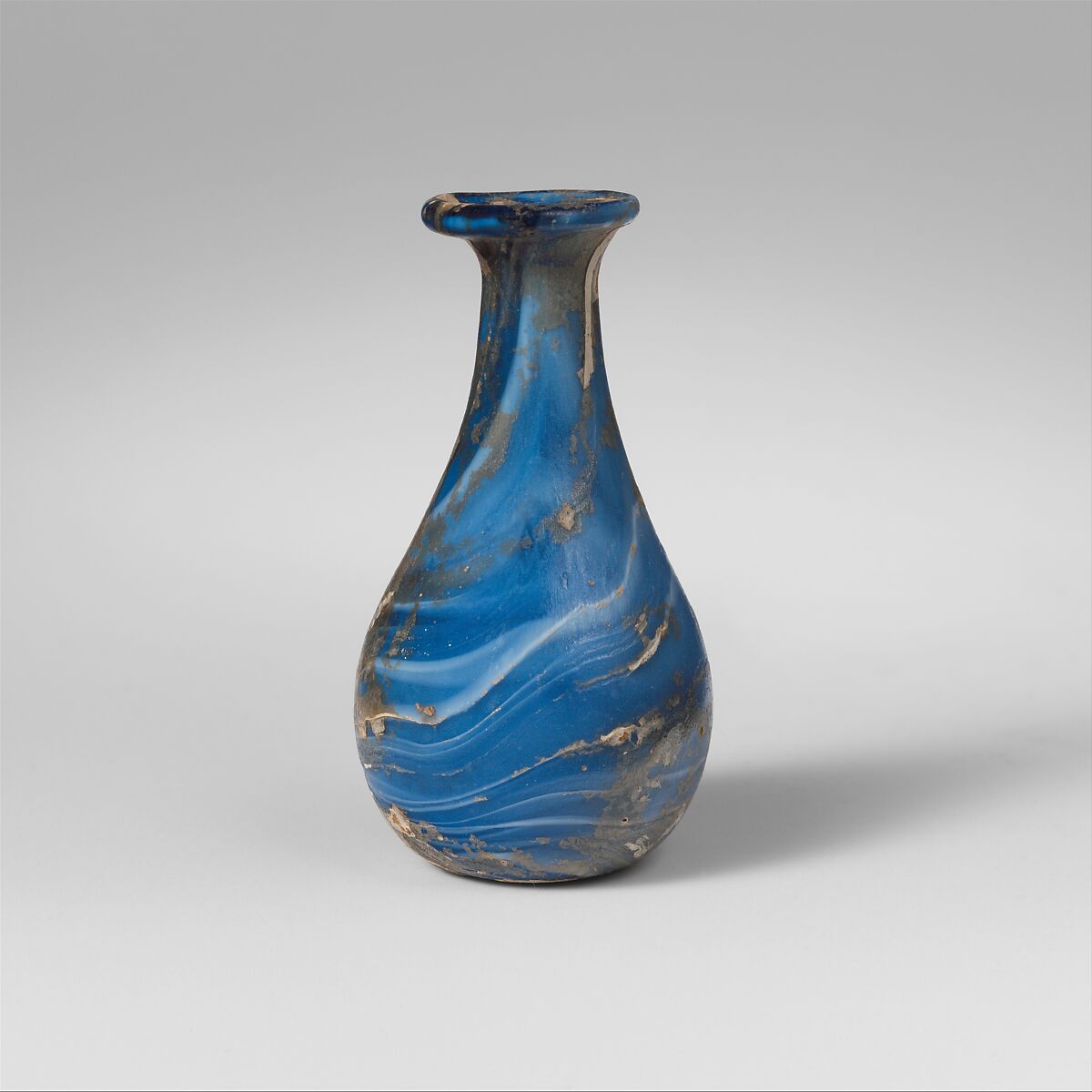 Rim folded out, over, and in, and smoothed into sides of flaring mouth; short, cylindrical neck, expanding downwards to join imperceptibly with ovoid body; flattened, slightly concave bottom. Numerous trails applied to gather and marvered into surface, forming an irregular way pattern extending from rim to bottom.