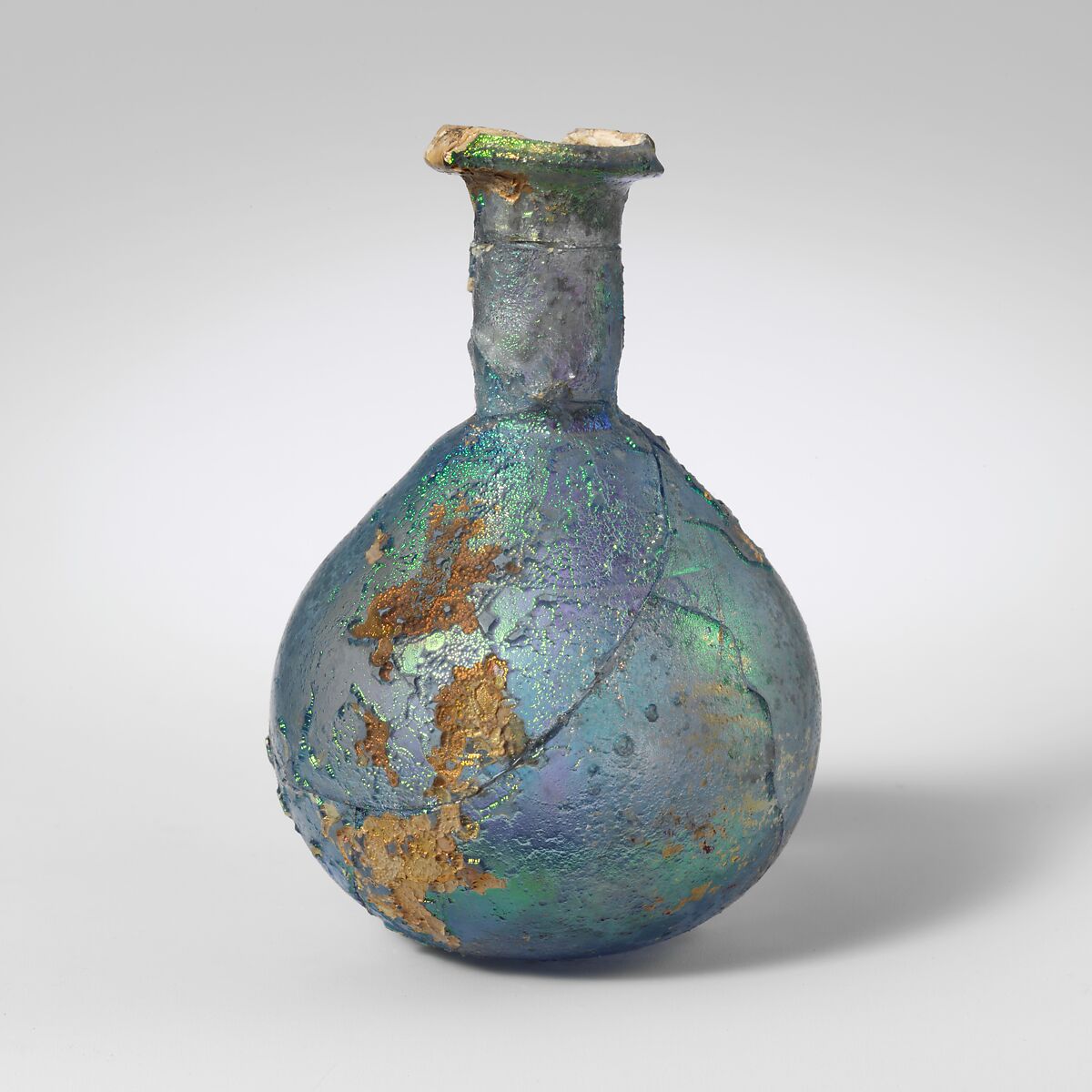 Broken and repaired, with numerous holes and losses, and many cracks; pinprick and larger bubbles; dulling, deep pitting, and brilliant iridescent weathering.