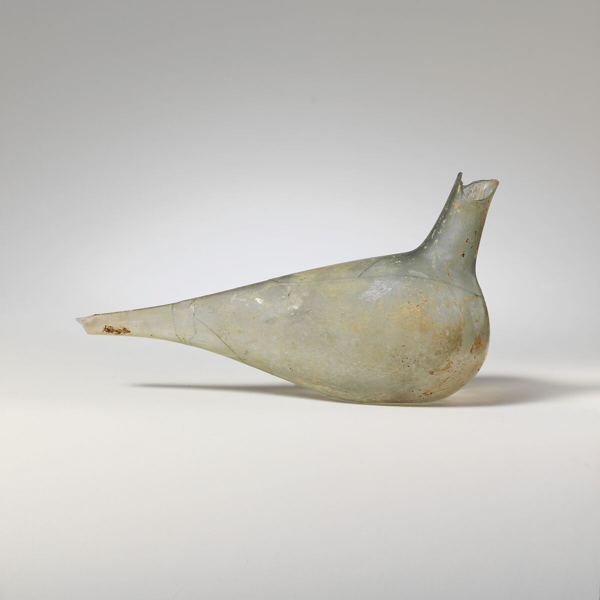 Broken and repaired, with rim and top of neck missing, three holes in body, and broken end to tail; many bubbles; dulling, faint iridescence, and light creamy weathering.
