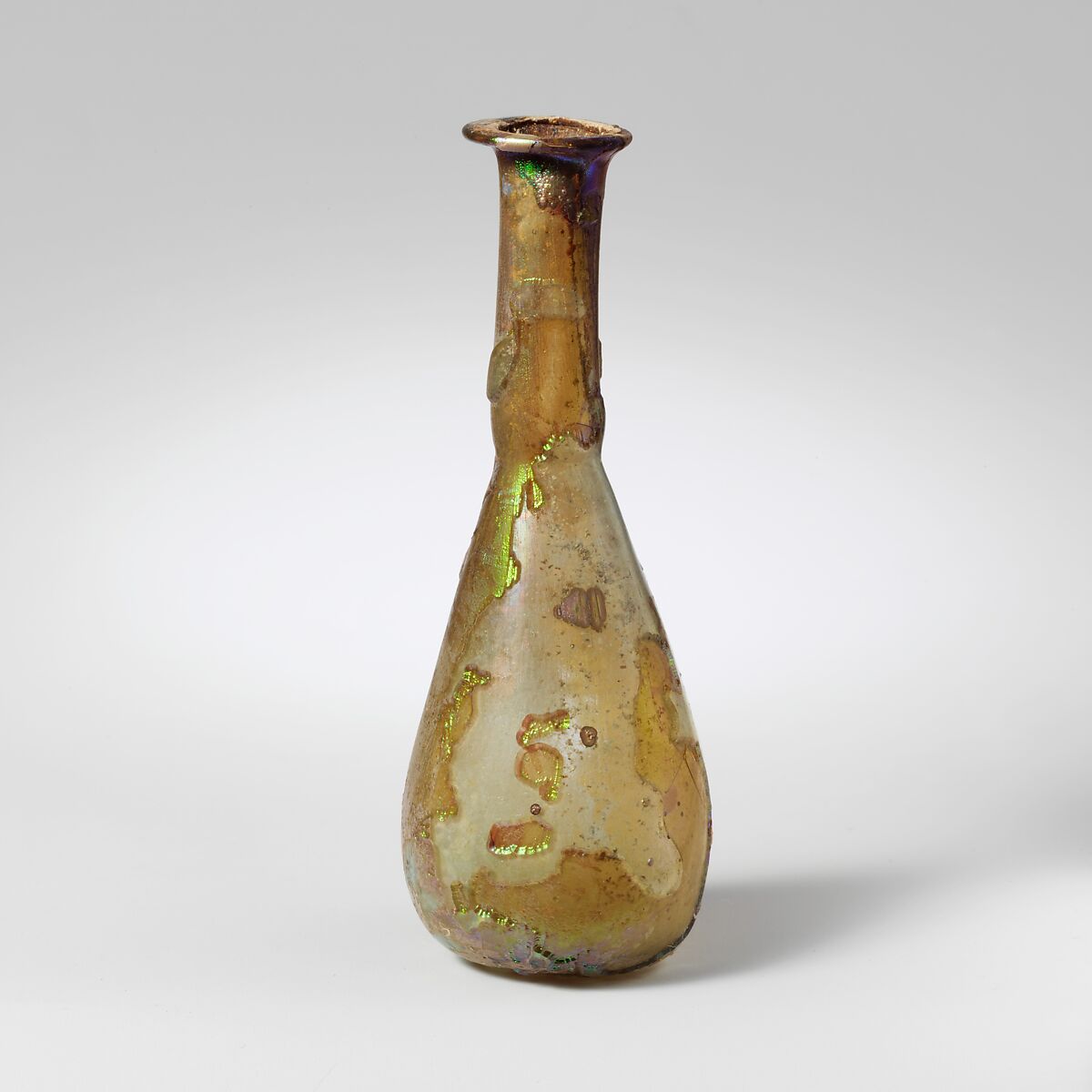 Lopsided rim folded out, over, and in, and pressed flat; slender, cylindrical neck, tooled in around base; elongated piriform body; concave bottom.