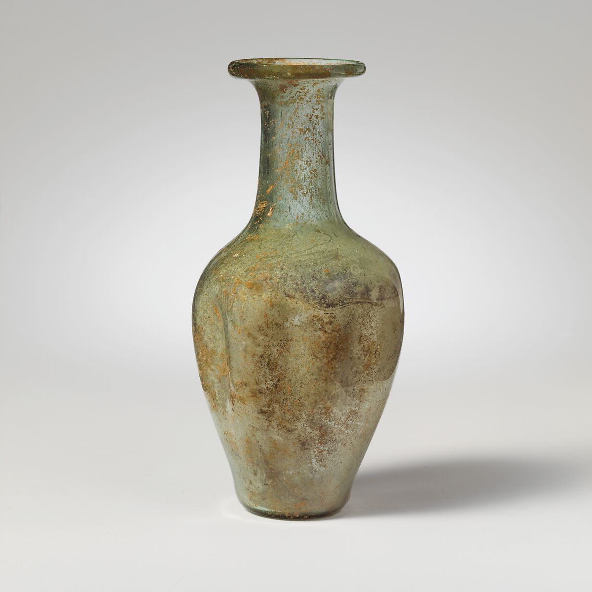 Rounded rim, folded out, over, and in, and beveled inner lip; flaring mouth; cylindrical, slightly concave; broad, sloping shoulder; bulbous body, with sides tapering downward and with seven elongated indents; round, pushed-in bottom, with traces of pontil scar.