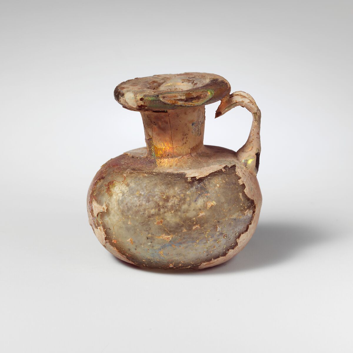 Rim folded out, round, and in, flattened on top; short, slightly funnel-shaped neck, with tooling marks around base; horizontal shoulder; squat, bulbous body; bottom concave at center; rod handle applied in a pad on outer edge of shoulder, drawn up and bent in, attached to lower edge of rim and trailed off below.