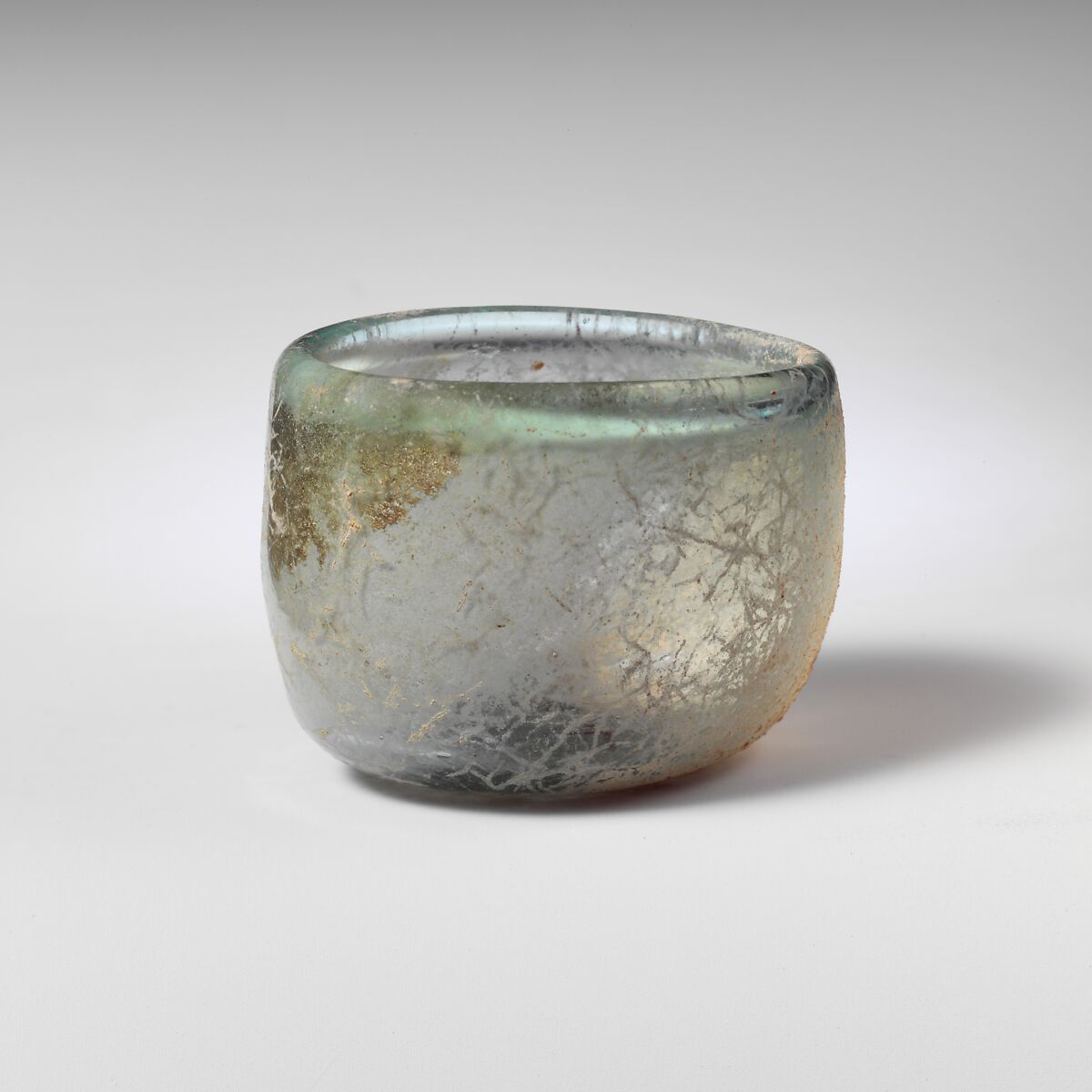 Rounded and thickened rim with inner lip; convex sides to cylindrical body; flat bottom with small, central kick and traces of large pontil scar.