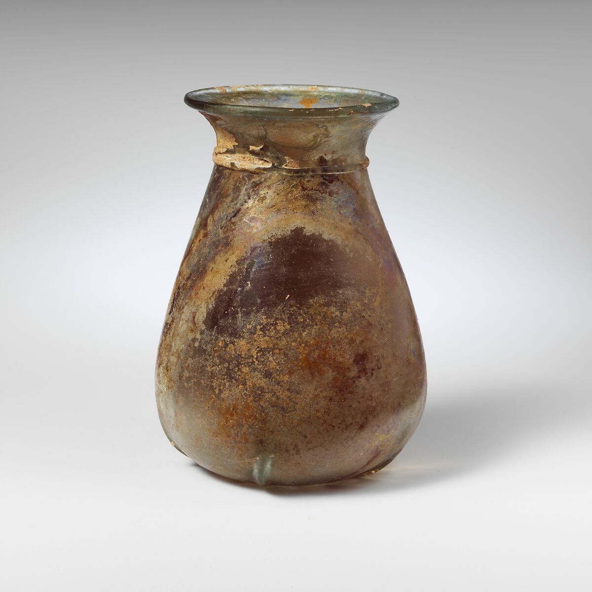 Intact; pinprick bubbles and blowing striations; dulling, pitting, and patches of creamy weathering on exterior; soil encrustion with weathering and iridescence on interior.