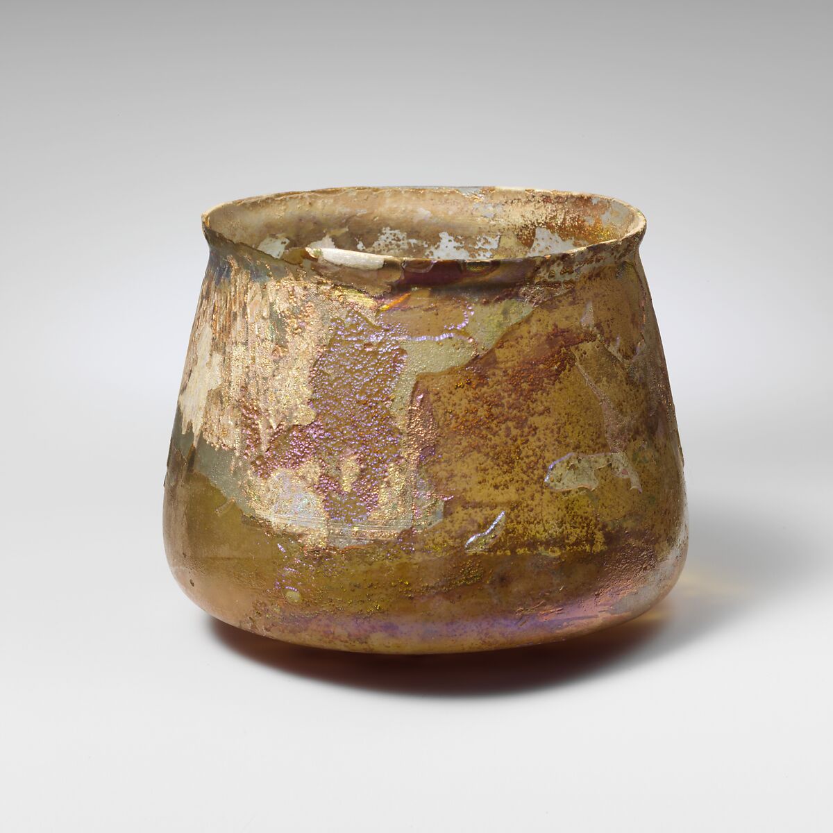 Intact, except for weathered chip in rim; some bubbles; dulling, deep pitting, and brilliant iridescent weathering.