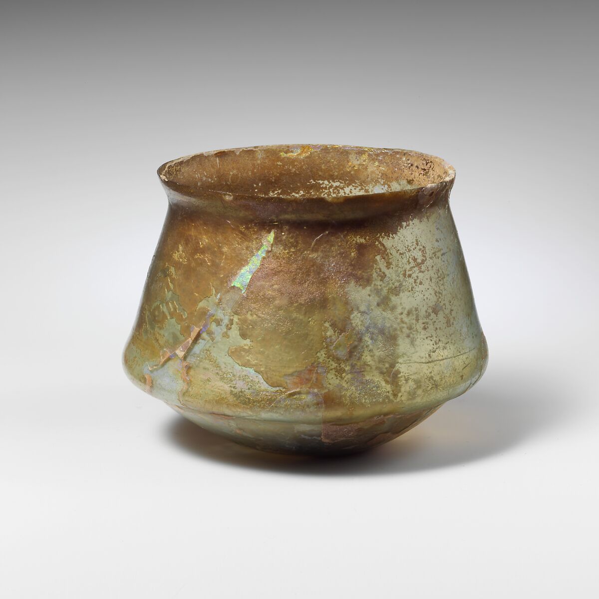 Knocked-off, uneven rim; slightly bulging collar below rim; sides expanding downward, then angled in with bulge at top to join small bottom with deep central kick.