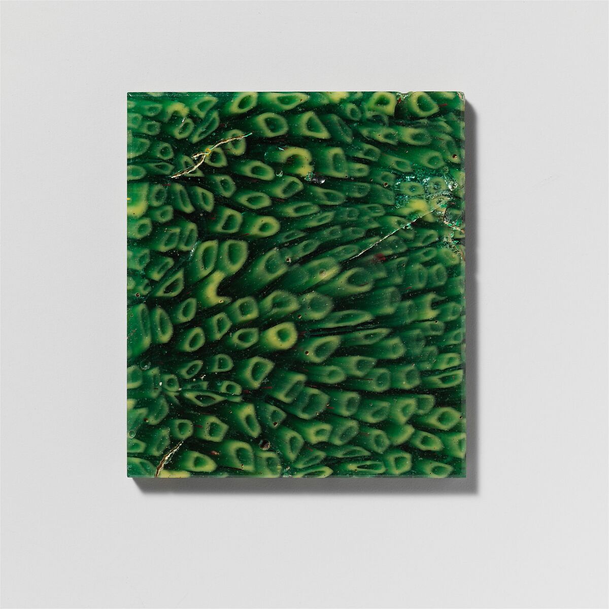 Probably cut into rectangle and upperside and edges polished in modern times; some deep pitting, dulling and iridescent weathering on underside.