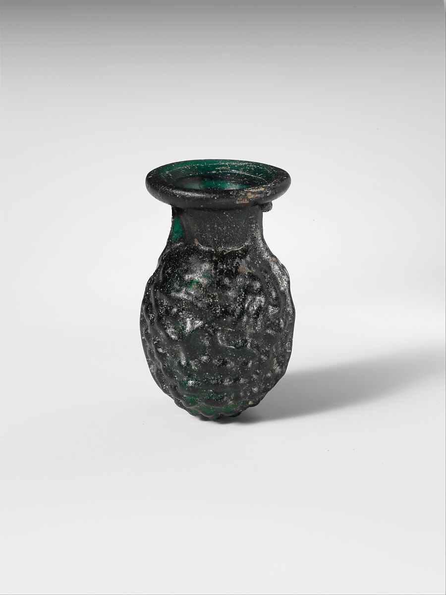 Blown in a two-part negative mold to produce relief decoration on body comprising tightly packed small knobs, probably imitating a bunch of grapes.