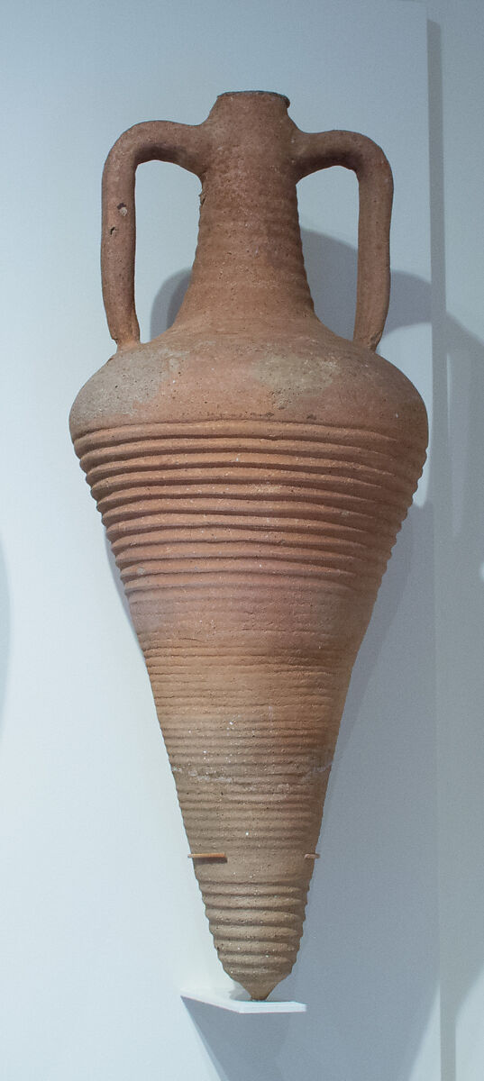 Red clay with pointed bottom, and moulded lines on body and neck.