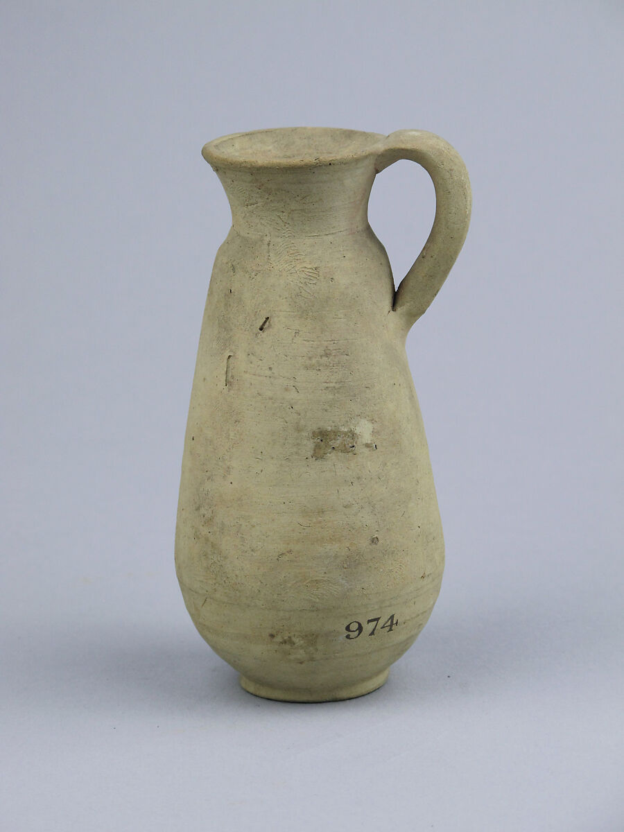 One-handled jug with flaring mouth; unpainted clay.