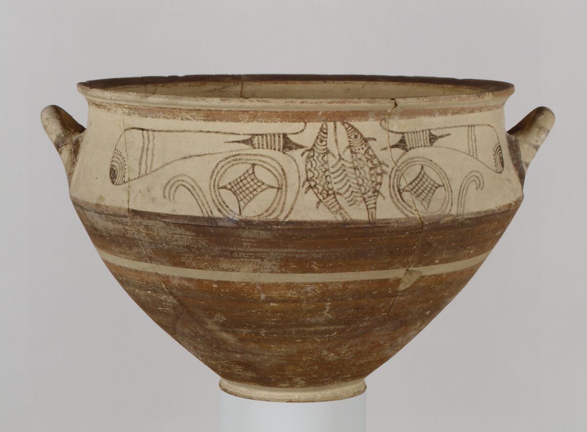 The shape and decoration of this krater are derived from Aegean models of the Mycenaean IIIC:1b period. Manufacture in Cyprus of this type of pottery may be associated with the settlement of Achaeans from the Aegean at this time. The two zones between the handles were painted over in black, which gives the false impression of bichrome decoration.