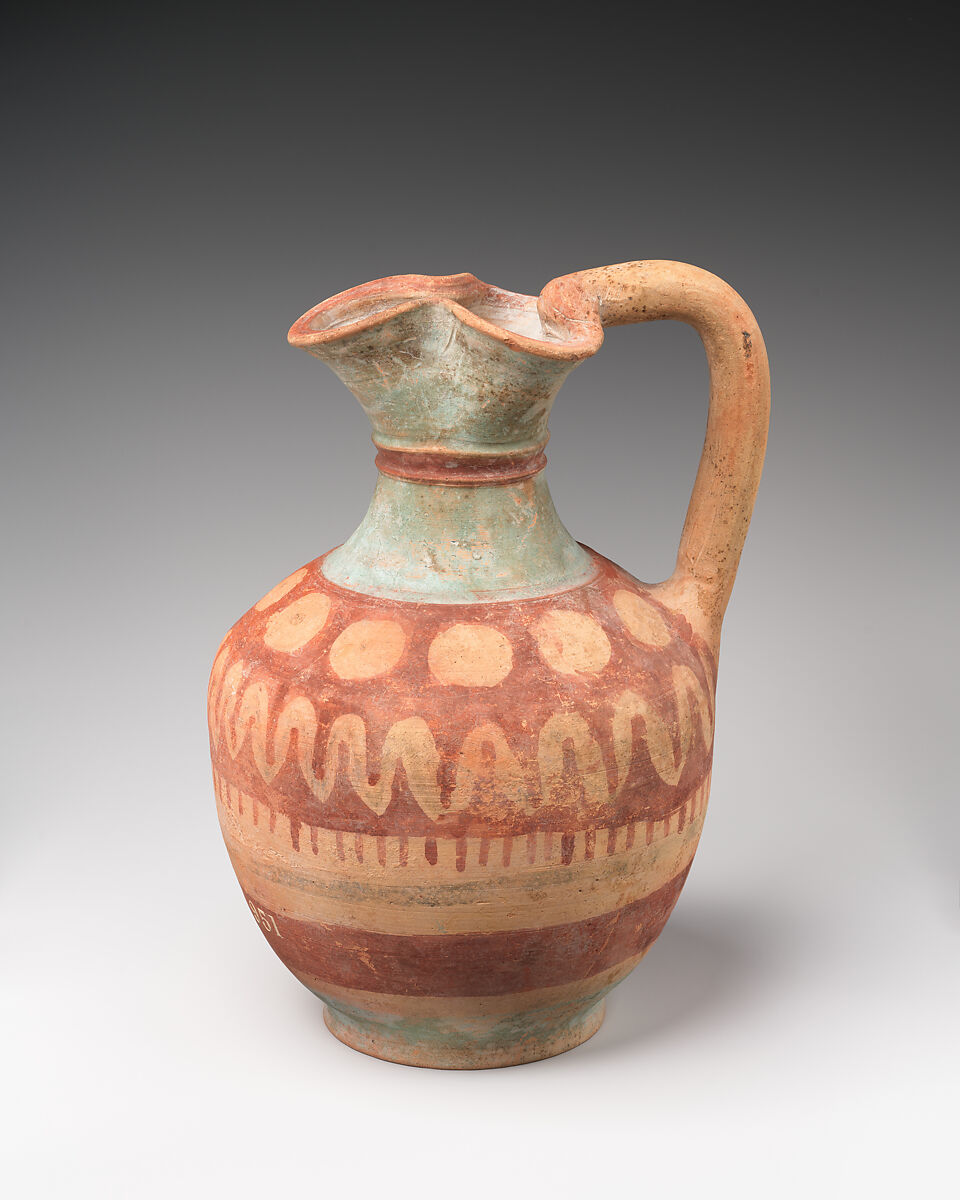 Trefoil oinochoe of reddish clay with bands of polychrome ornament, and deep blue on neck and foot. The bands of polychrome decoration are a striking and unusual feature, which finds few parallels even amongst contemporary Cypriot pottery.