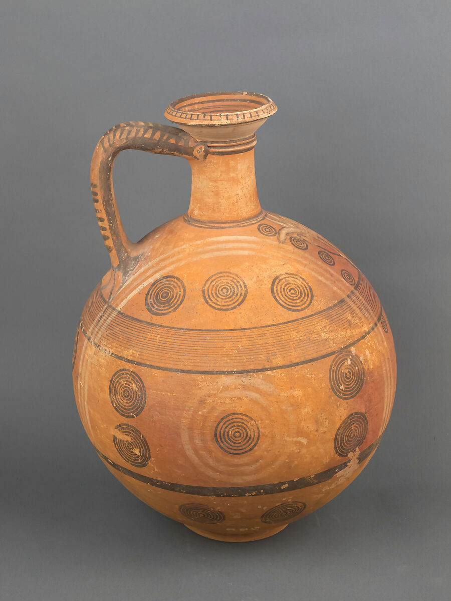 Oinochoe with bands and concentric circles, with lotus and other details in white.