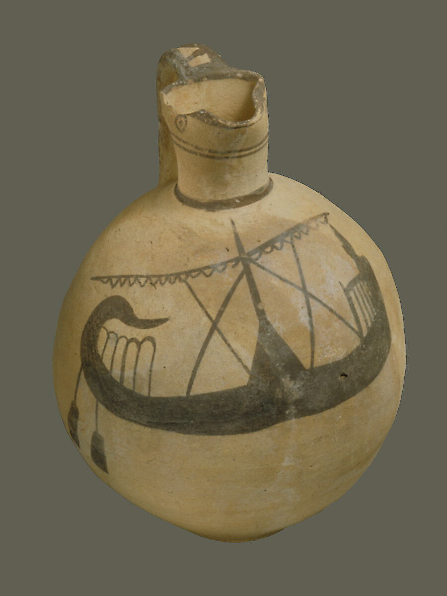 Ships provided the link between Cyprus and the surrounding world, and the island was renowned for its shipbuilding. The vessel here is clearly provided with a mast, a sail shown furled, and a pair of steering oars. Of particular interest is the bird's head ornamenting the stern. This feature seems to have originated in the Aegean during the prehistoric period, and it survived well into the first millennium B.C. We do not know if the ship is Cypriot or foreign.