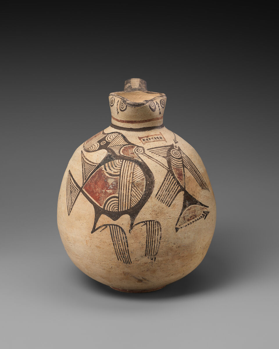 A bird is depicted with a fish that is probably to be understood as being held in its beak. The placement of the decoration on the vase, the combination of line and mass in articulating the forms, and the evocative use of arrowlike forms indicate a vase-painter of remarkable creativity.