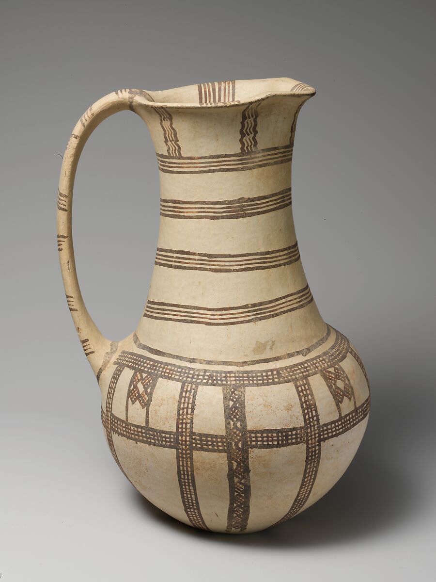 White slip ware with handle, pinched lip, lattice, lozenge and wavy lines.