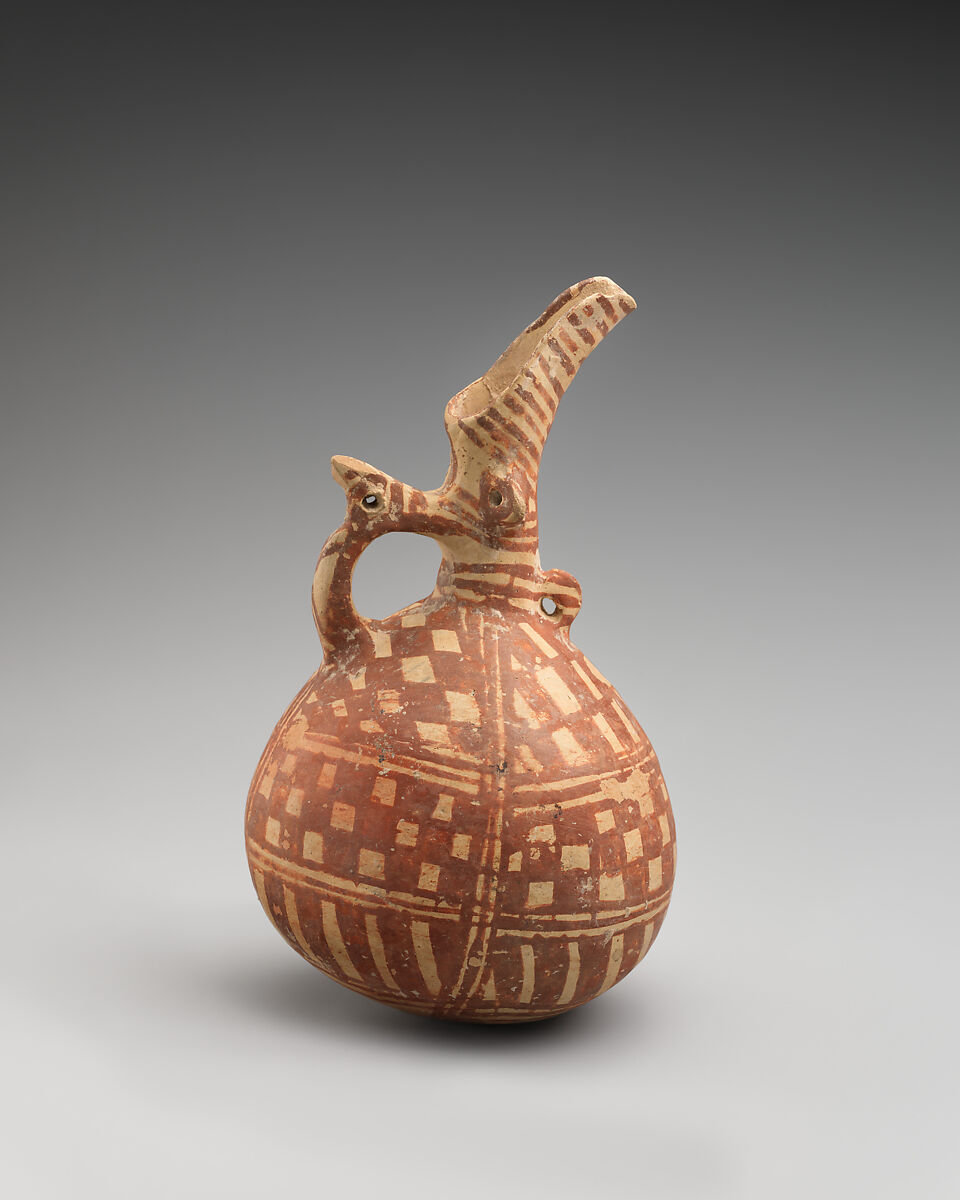 Globular juglet with horned handle, beaked spout, string-holes and chequer panels.