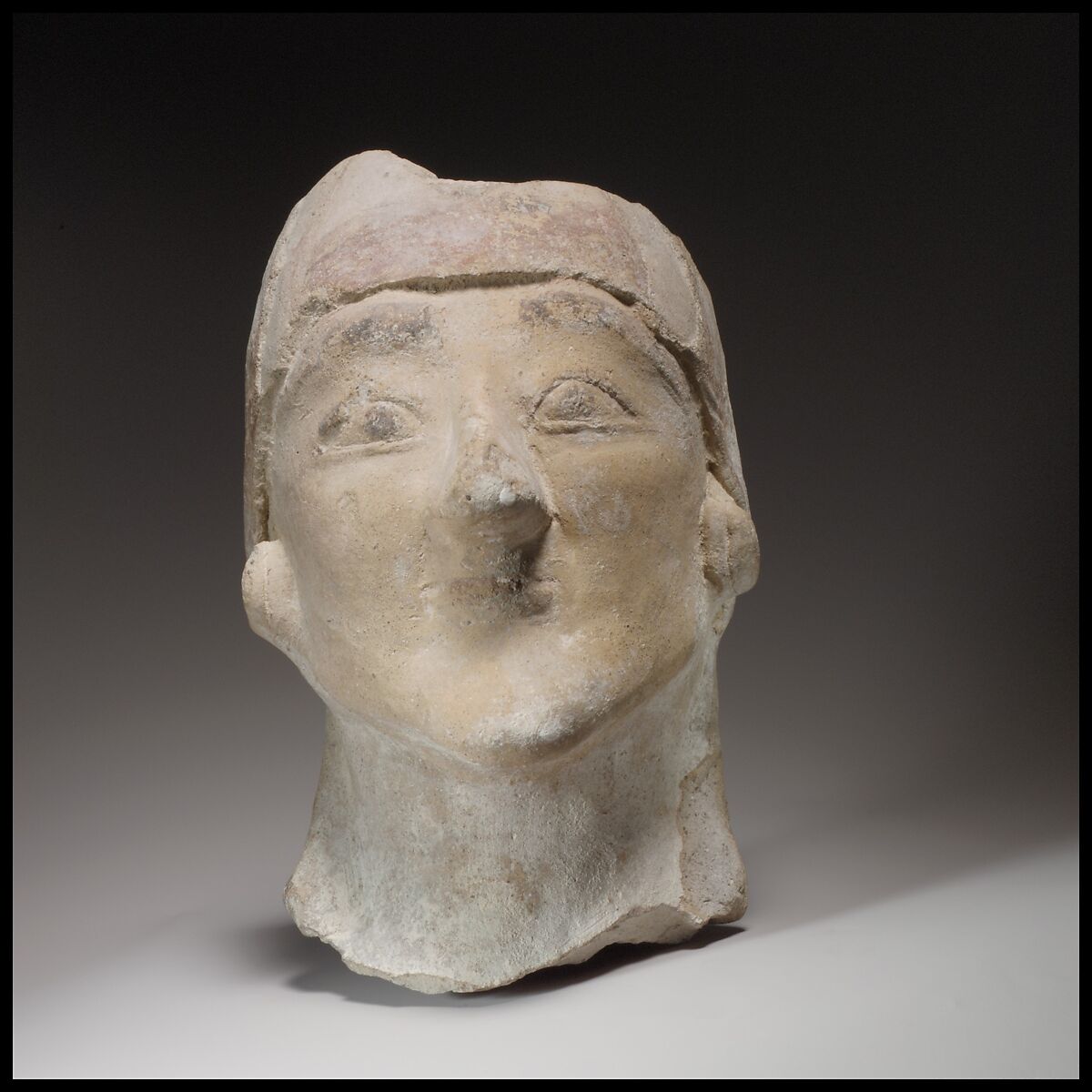 This mold-made beardless head has a very prominent chin, a short mouth, and ridged eyelids.