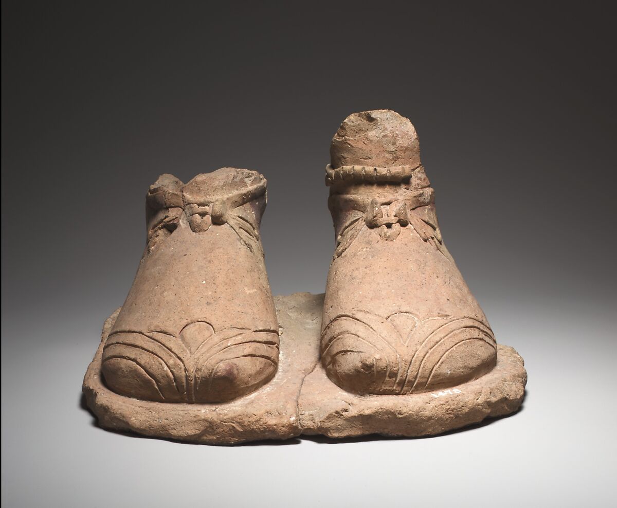 Hollow, mold-made feet wearing shoes, from a figure of approximately life size. The shoes, which reach to the base of the ankles, appear to be made of fairly stiff leather, tooled with a floral pattern at the toe. The pattern consists of a lotus flower of Archaic style at the center, flanked at either side by three lines curving down to the sole.