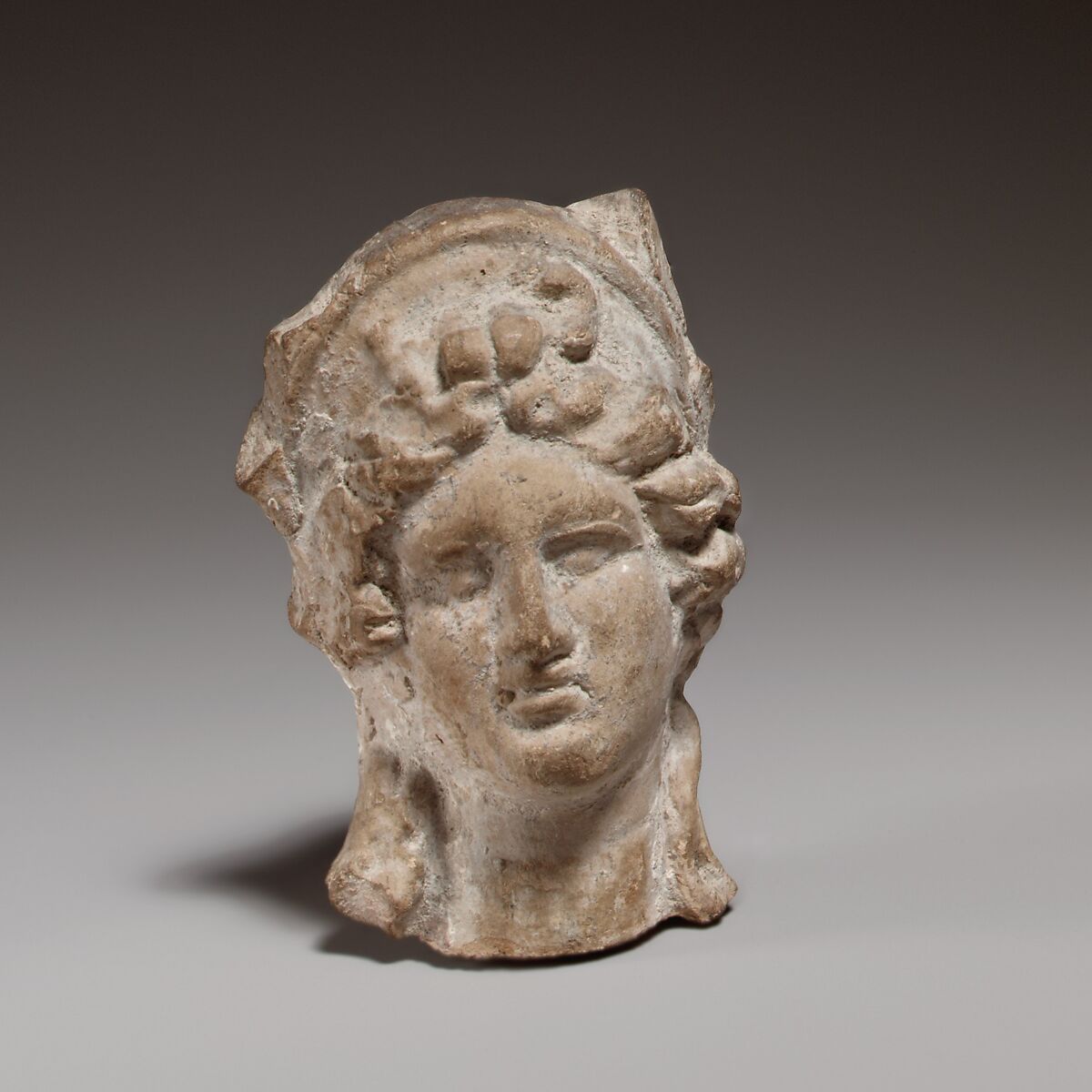 The head is mold-made and solid. The head and neck are preserved; the headdress is chipped. Blisters on the neck at the left side and at the right corner of the mouth indicate that the head was made in a plaster mold.