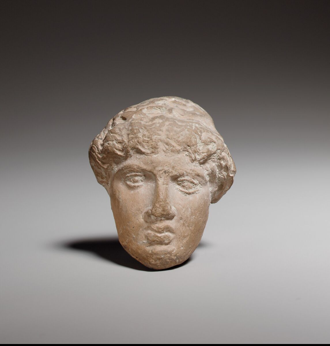 The head is mold-made and solid. It is broken around the jaw, preserving only the face and hair; the back of the head is missing.