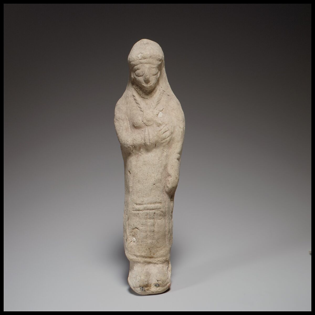 The solid figurine was made from a worn mold. The back is rounded and was reworked by hand on the left side. She stands on a small plinth.