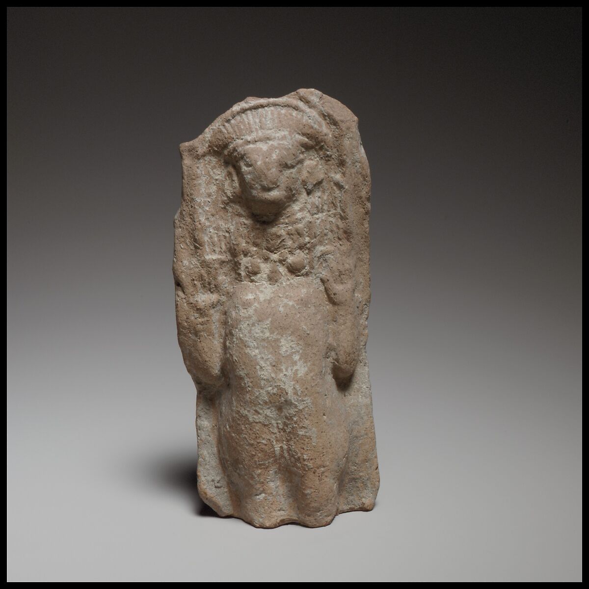 The figurine is solid and was made from a worn mold. The legs are missing below the knees. Part of the background is missing above the head. She stands in relief against a curved background,