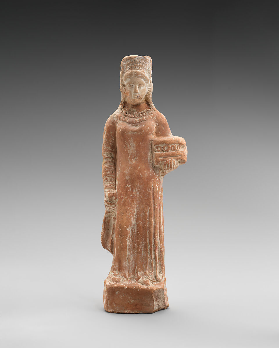 - Title:Terracotta figurine of a standing female votary holding a box