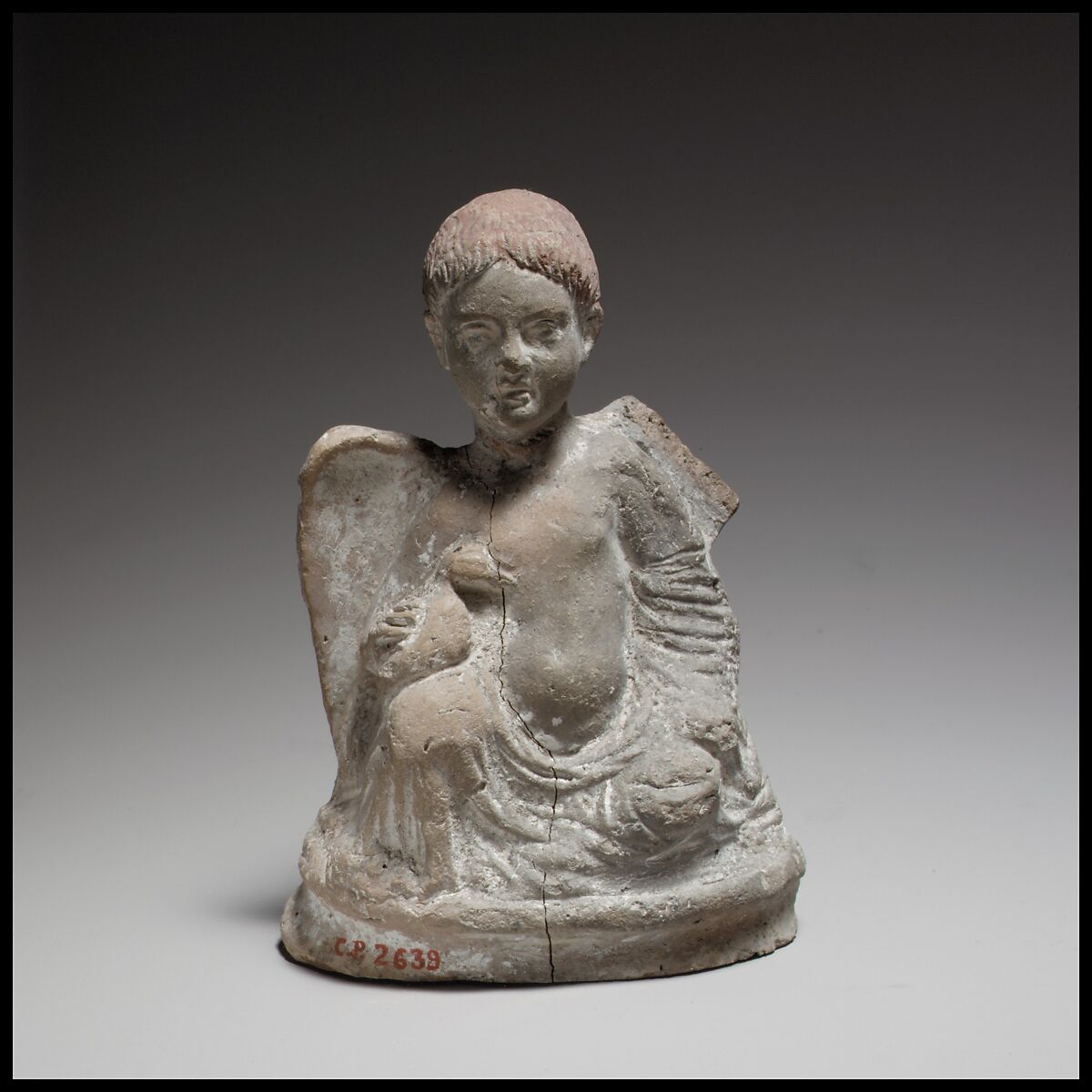 - Title:Terracotta statuette of Eros seated and holding a duck