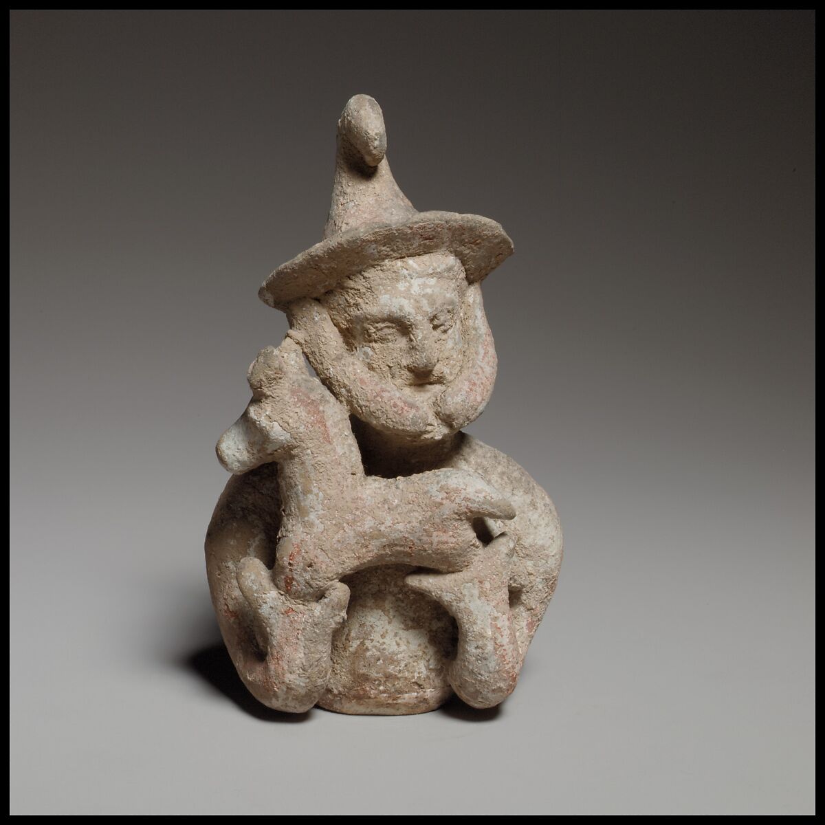 The figurine is handmade and solid, with a mold-made face. Only the upper part of the figurine is preserved. He holds a small horned quadruped against his chest with both hands.