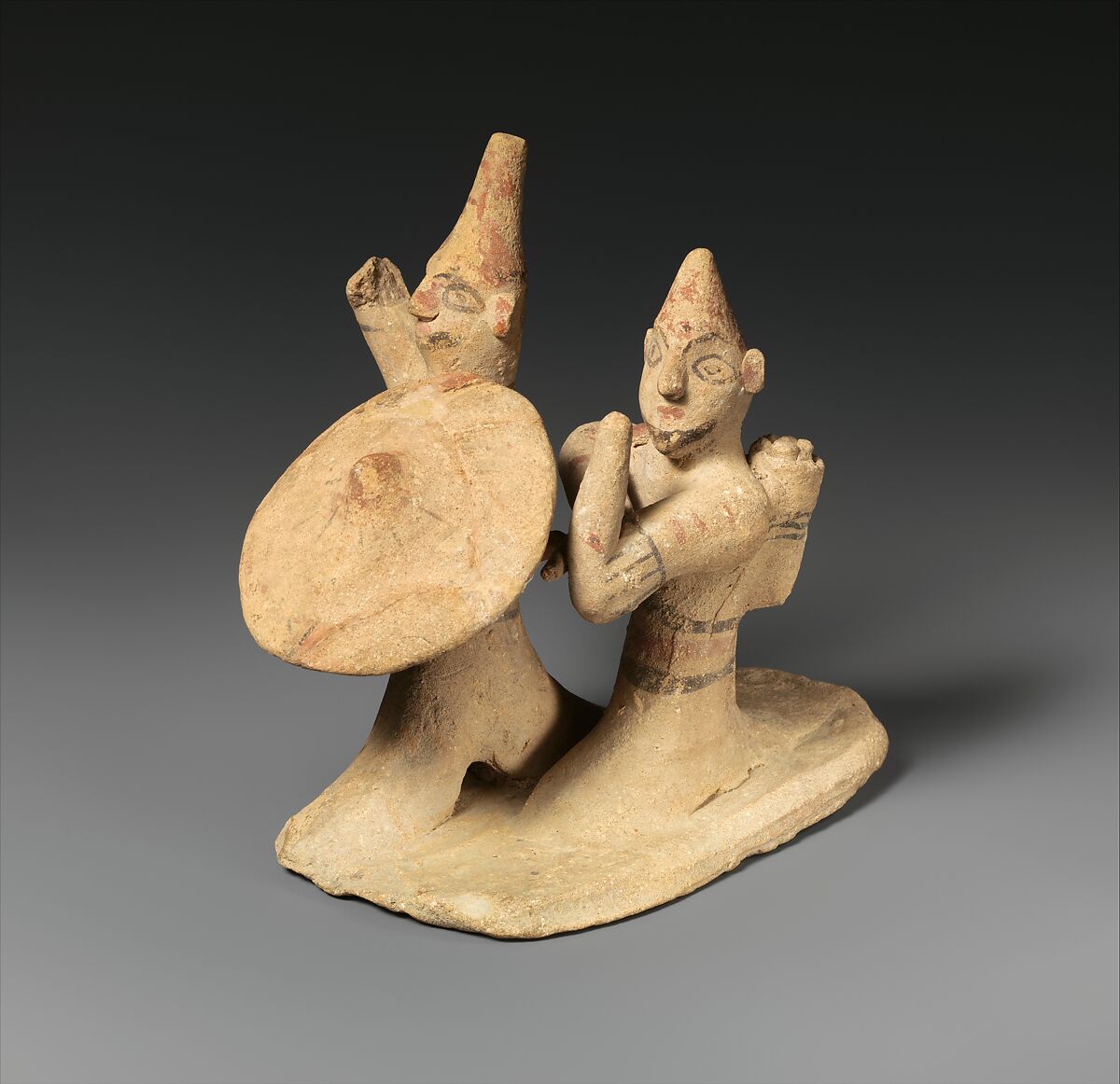 This exceptional group shows a foot soldier, with conical helmet and round shield, beside an archer, with bow and quiver. Summary though it may be, the piece probably reflects political realities in Archaic Cyprus, which experienced successive domination by Assyria, Egypt, and Persian between the end of the eighth and the second half of the sixth century B.C.