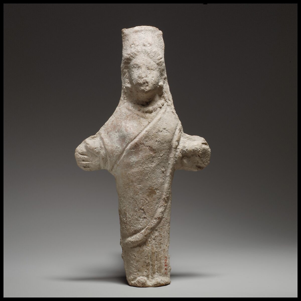 The solid head and body are mold-made, the arms handmade. The back is handmade, flat, and pared. The crude, cruciform figure is in a frontal pose, the feet close together.