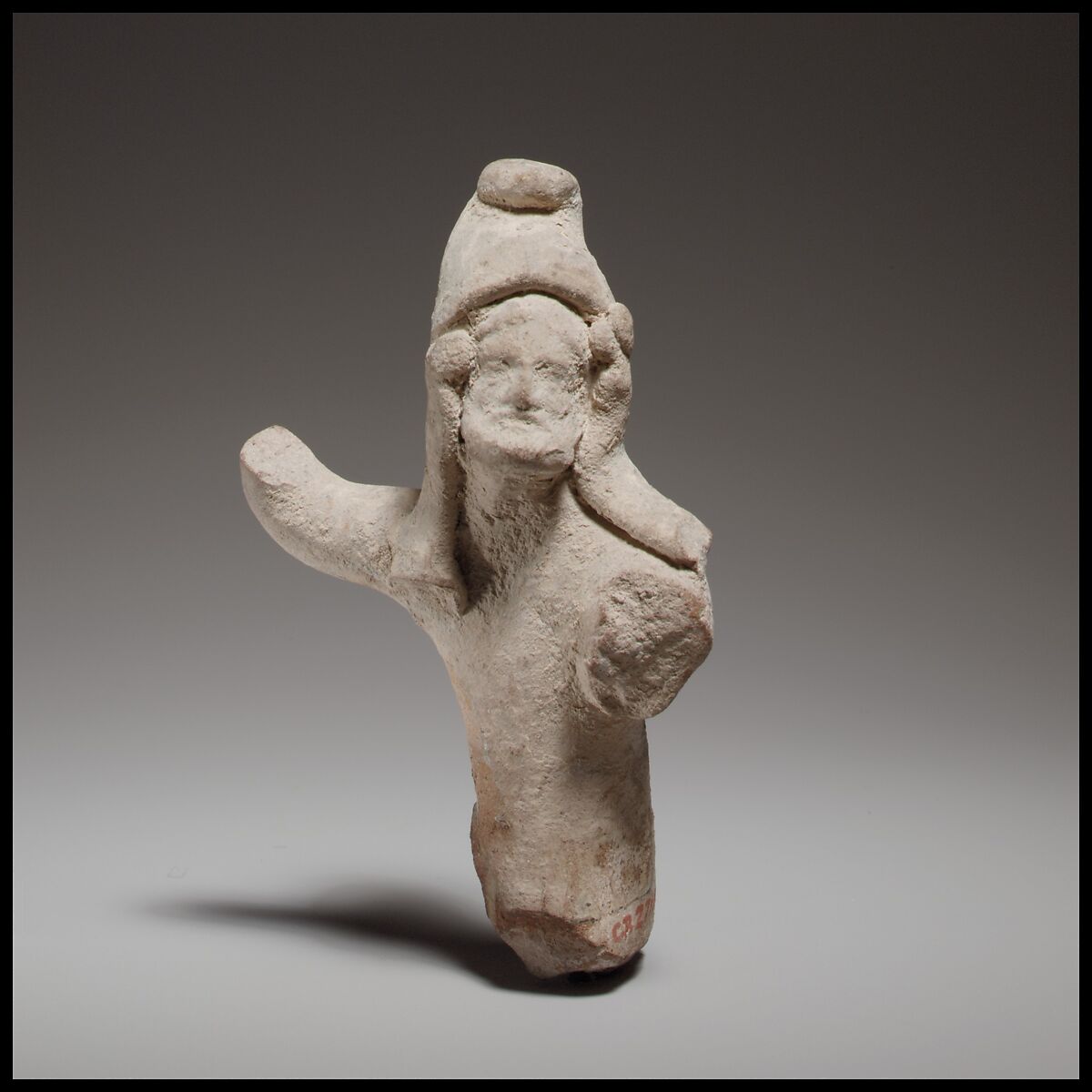 The figurine is handmade and solid, with a mold-made face. The nude, bearded figure is preserved to the hips, where it is broken diagonally from the rest of the figurine, which must have been a horse-and-rider group.