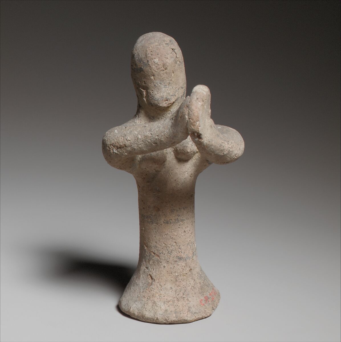 The solid, cylindrical wheel-made body flares toward a concave base. The arms, added by hand, curve in front of the chest.