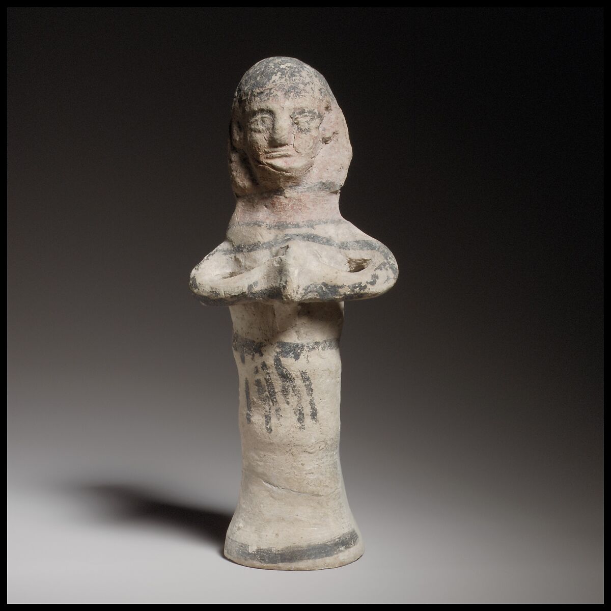 The figurine, of uncertain gender, is in the Kamelarga style. It is wheel-made and hollow, with a cylindrical body that flares at the bottom. The head is mold-made, the arms handmade