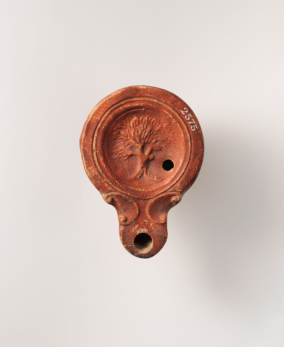 Loeschcke Type 4. Mold-made. Discus: oak (?) tree; a single filling hole near edge at lower right; band of lines and grooves towards edge; Volutes flanking broad, rounded nozzle. Incised base ring, and raised, flat base; elongated footprint stamp at center.